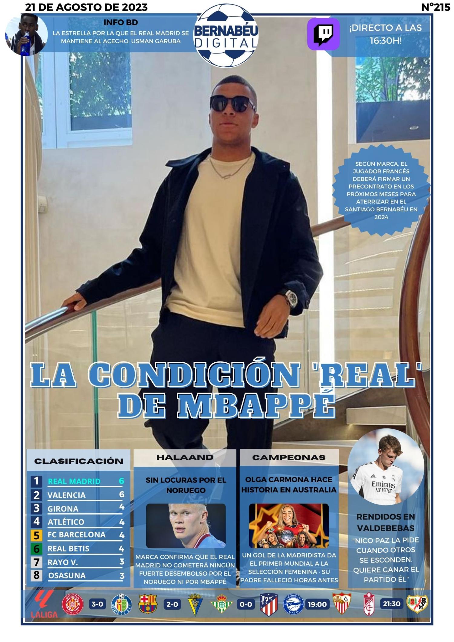 En la portada de Bernabéu Digital de este lunes abrimos con la condición del Real Madrid para fichar a Kylian Mbappé: firmar un precontrato en 2024. Asimismo, destacamos la postura del club blanco con Haaland, el Mundial Femenino de España, la ilusión con Nico Paz y la INFO BD sobre Garuba.