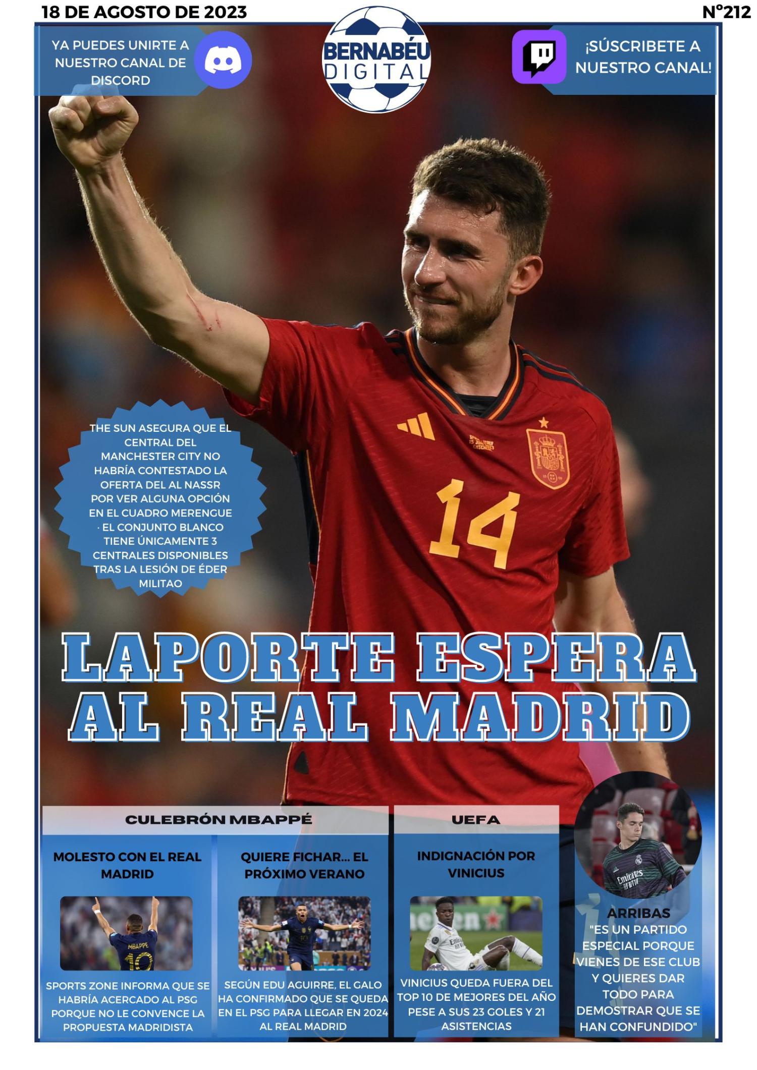 En la portada de Bernabéu Digital de este viernes hemos querido destacar la información desde Inglaterra con el posible fichaje de Laporte por el Real Madrid. Además, también destacamos las palabras de Sergio Arribas, la última hora del culebrón Mbappé y la indignación en el madridismo con la UEFA por Vinicius.