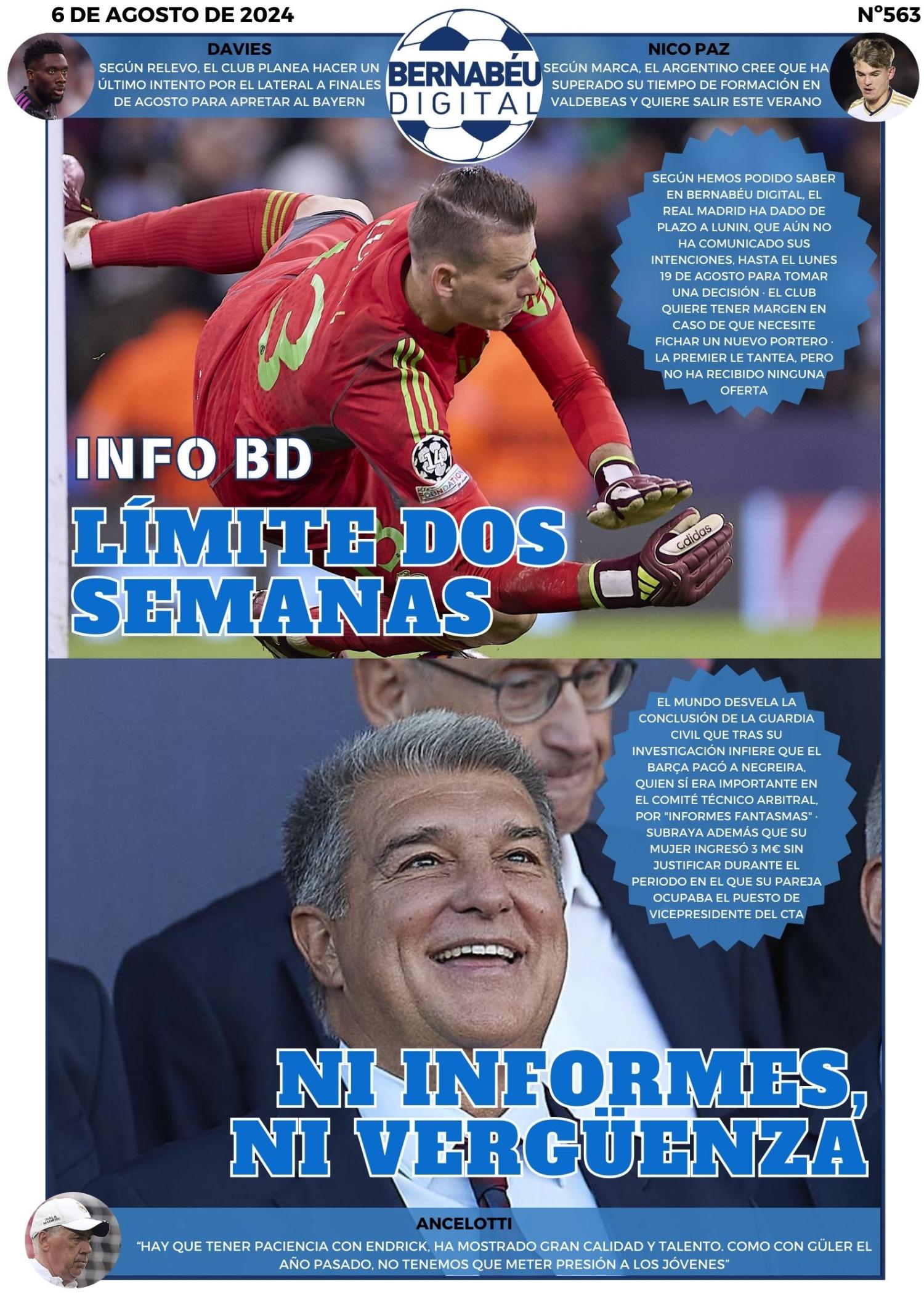 En la portada BD de este martes destacamos la última INFO BD sobre los límites que le han marcado en el Real Madrid a Lunin para decidir su futuro y también sobre la última hora del Caso Negreira. Además, hacemos referencia al giro en el futuro de Davies y también la posible salida de Nico Paz.