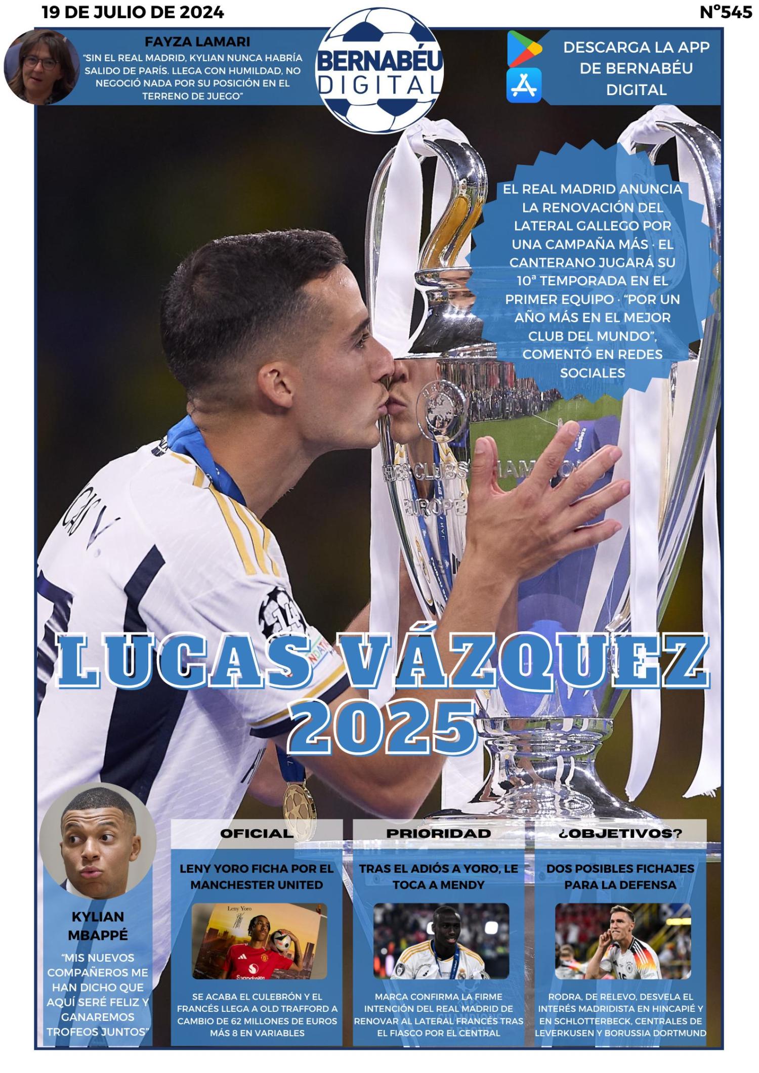 La portada de hoy de Bernabéu Digital destaca la renovación de Lucas Vázquez con el Real Madrid por una temporada más. Además, Leny Yoro ya ha alcanzado su salida al Manchester United. Esta, y más noticias, en Bernabeudigital.com.