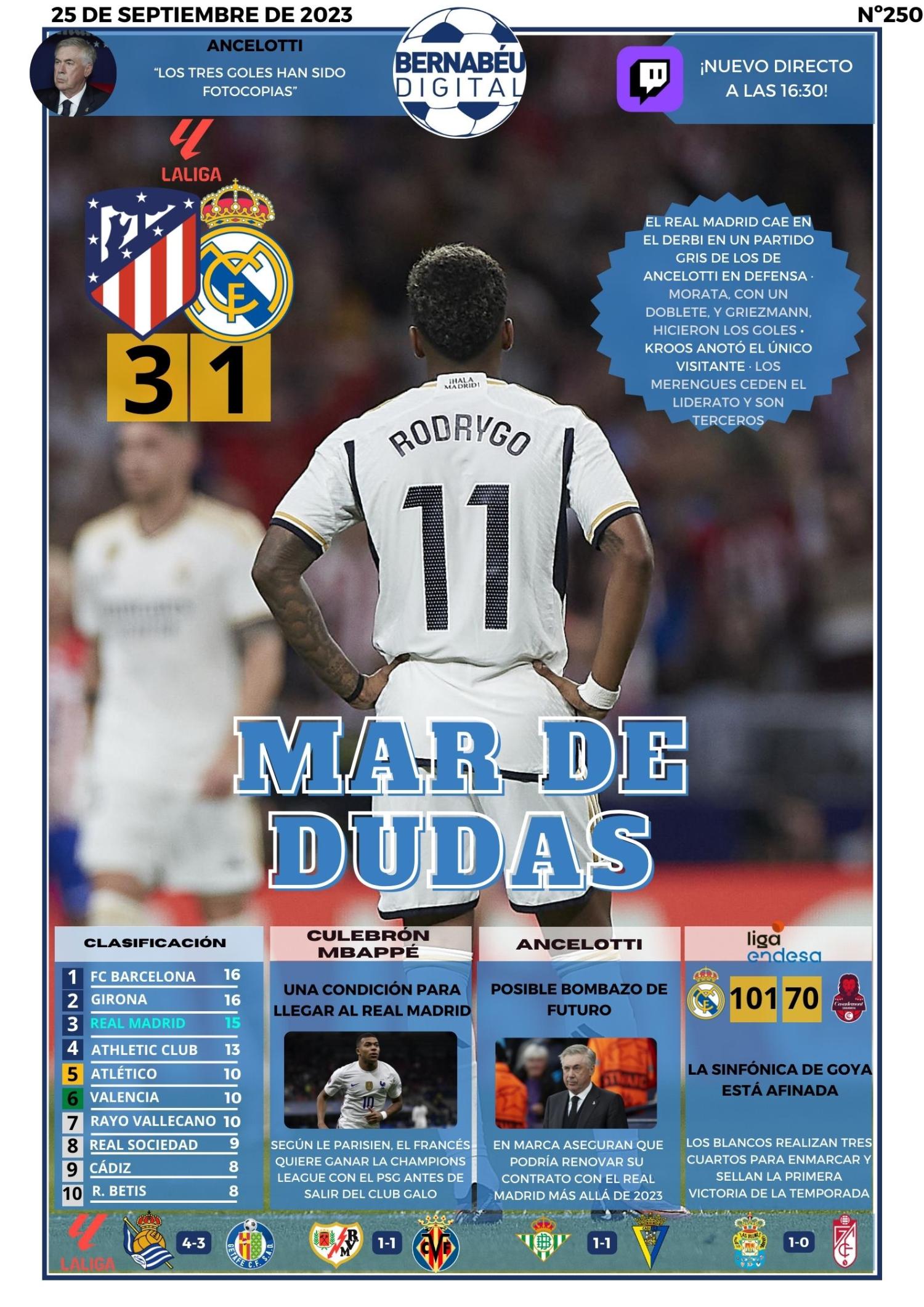 En la portada BD de este lunes hemos querido destacar el derbi madrileño entre el Atlético de Madrid y el Real Madrid con las reacciones de Carlo Ancelotti. También hemos hecho hincapié en el posible bombazo con el técnico italiano, la condición que ha puesto Mbappé para fichar por el conjunto blanco y la victoria de los de Chus Mateo en el primer partido de la Liga Endesa.