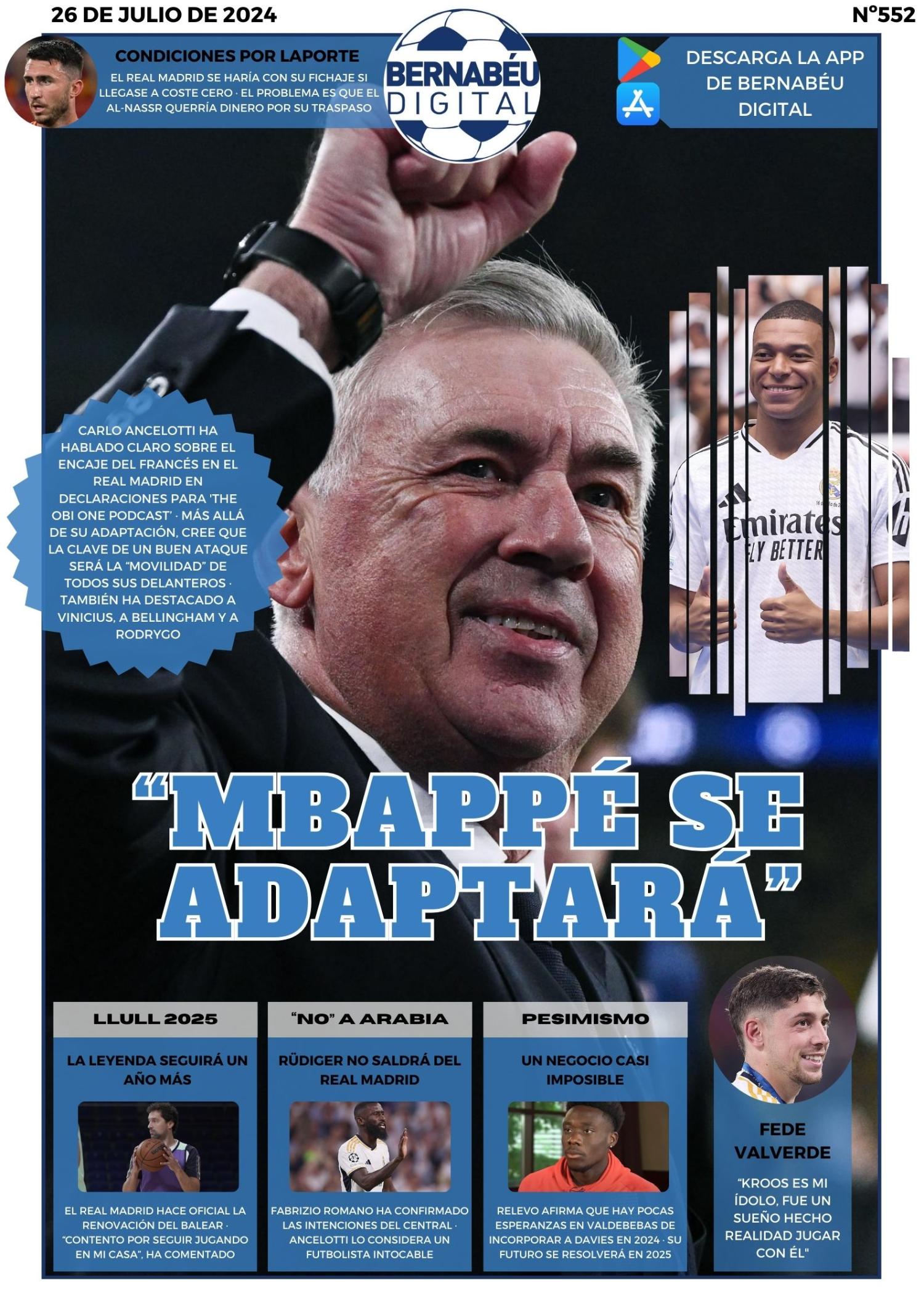 La portada de hoy de Bernabéu Digital destaca las declaraciones de Carlo Ancelotti sobre el encaje de Kylian Mbappé en el Real Madrid. El entrenador italiano apunta que no habrá ningún tipo de problemas con él.