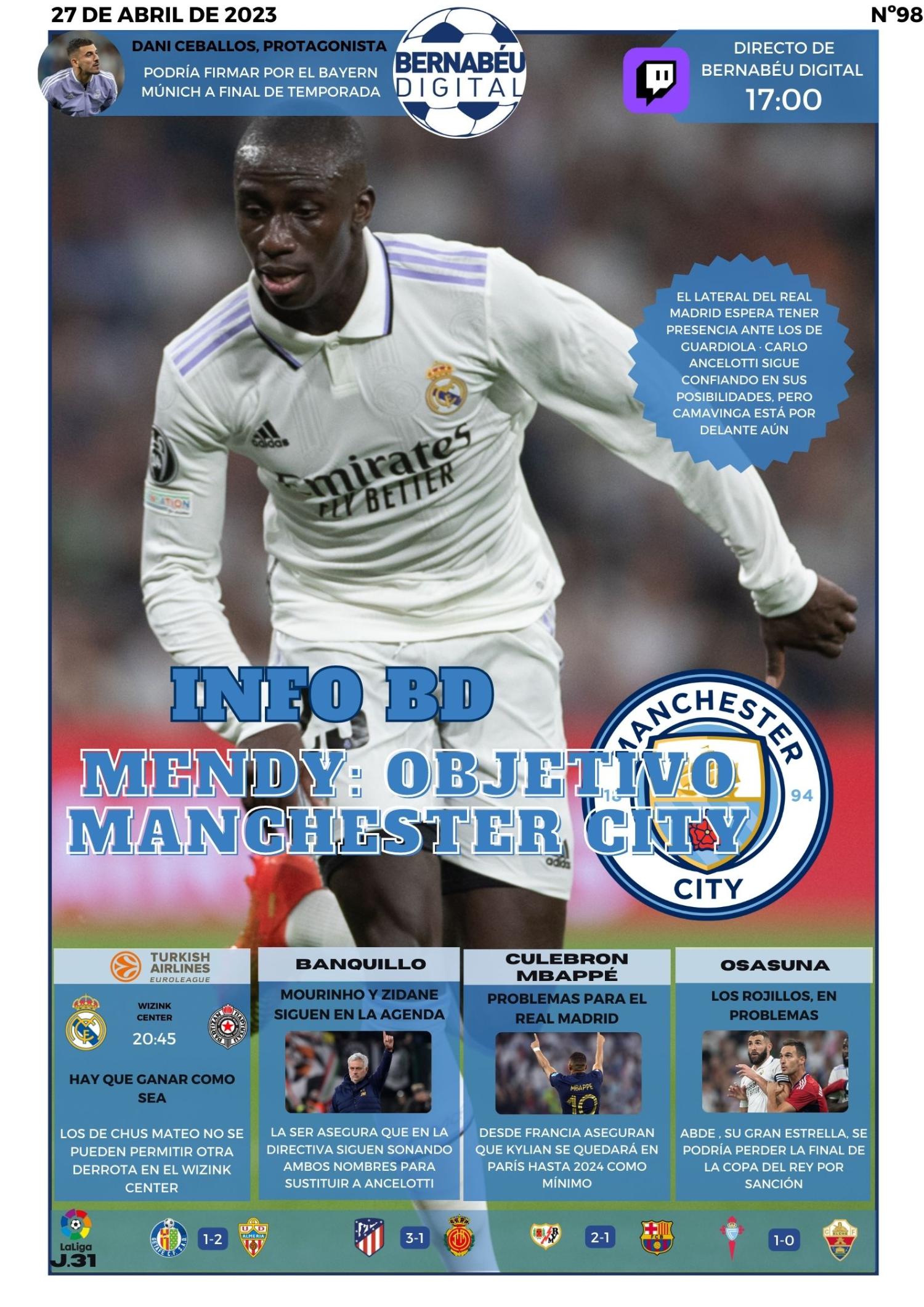 En la portada del 27 de abril Bernabéu Digital destaca la INFO BD sobre Ferland Mendy. El lateral francés sigue lesionado pero el objetivo es que pueda estar disponible para medirse al Manchester City en un par de semanas. Además, los rumores de mercado vuelven a protagonizar la actualidad del Real Madrid. Kylian Mbappé vuelve a ser noticia, pero esta vez de forma negativa para los madridistas debido a que los periodistas franceses no le ven fuera del PSG hasta 2024. Ceballos podría llegar al Bayern Múnich y Zinedine Zidane y Mourinho suenan con fuerza para recalar en el Santiago Bernabéu.