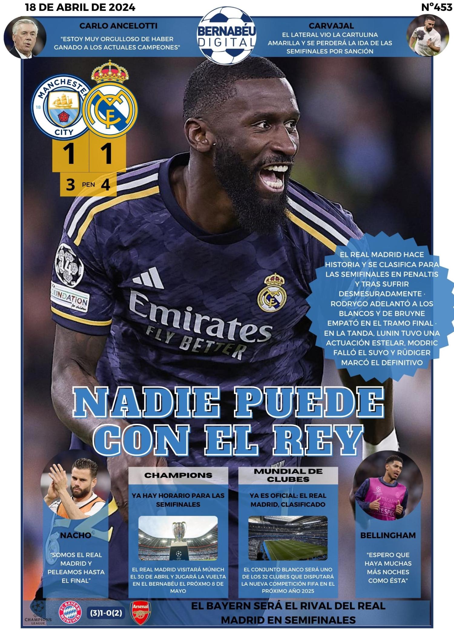 En la portada BD de este jueves destacamos y analizamos el encuentro entre el Real Madrid y el Manchester City que se ha saldado con la clasificación del conjunto blanco tras vencer en la tanda de penaltis. Destacamos las palabras de Ancelotti, de Bellingham, de Nacho y también el horario de la semifinal contra el Bayern y la sanción a Carvajal.