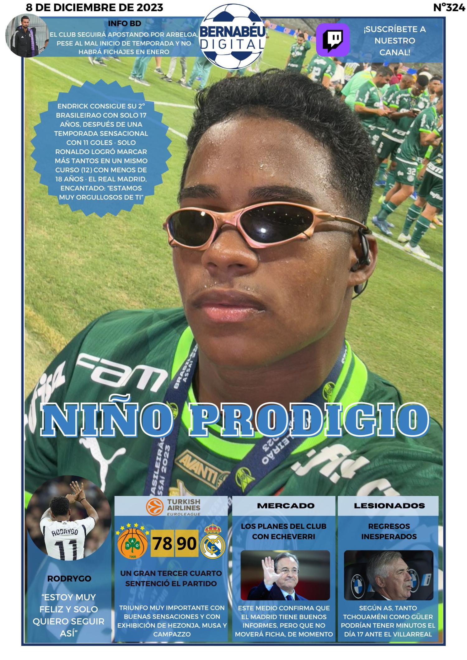 Este viernes 8 de diciembre, en Bernabéu Digital destacamos en nuestra portada a Endrick y su segundo Brasileirao con el Palmeiras. Un nuevo título de campeón de liga tras una temporada extraordinaria para el jovencísimo delantero brasileño, propiedad del Real Madrid.