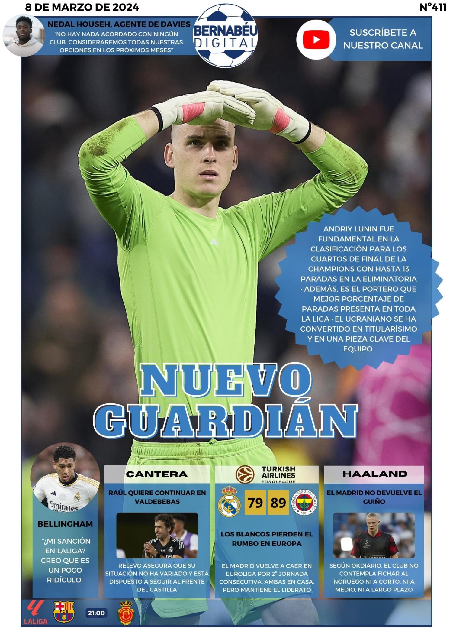 Este viernes 8 de marzo de 2024, en Bernabéu Digital destacamos en portada al "nuevo guardián" del Real Madrid: Andriy Lunin. Asimismo, resaltamos otras noticias como la derrota del equipo de baloncesto o las declaraciones del representante de Alphonso Davies; entre otros temas.