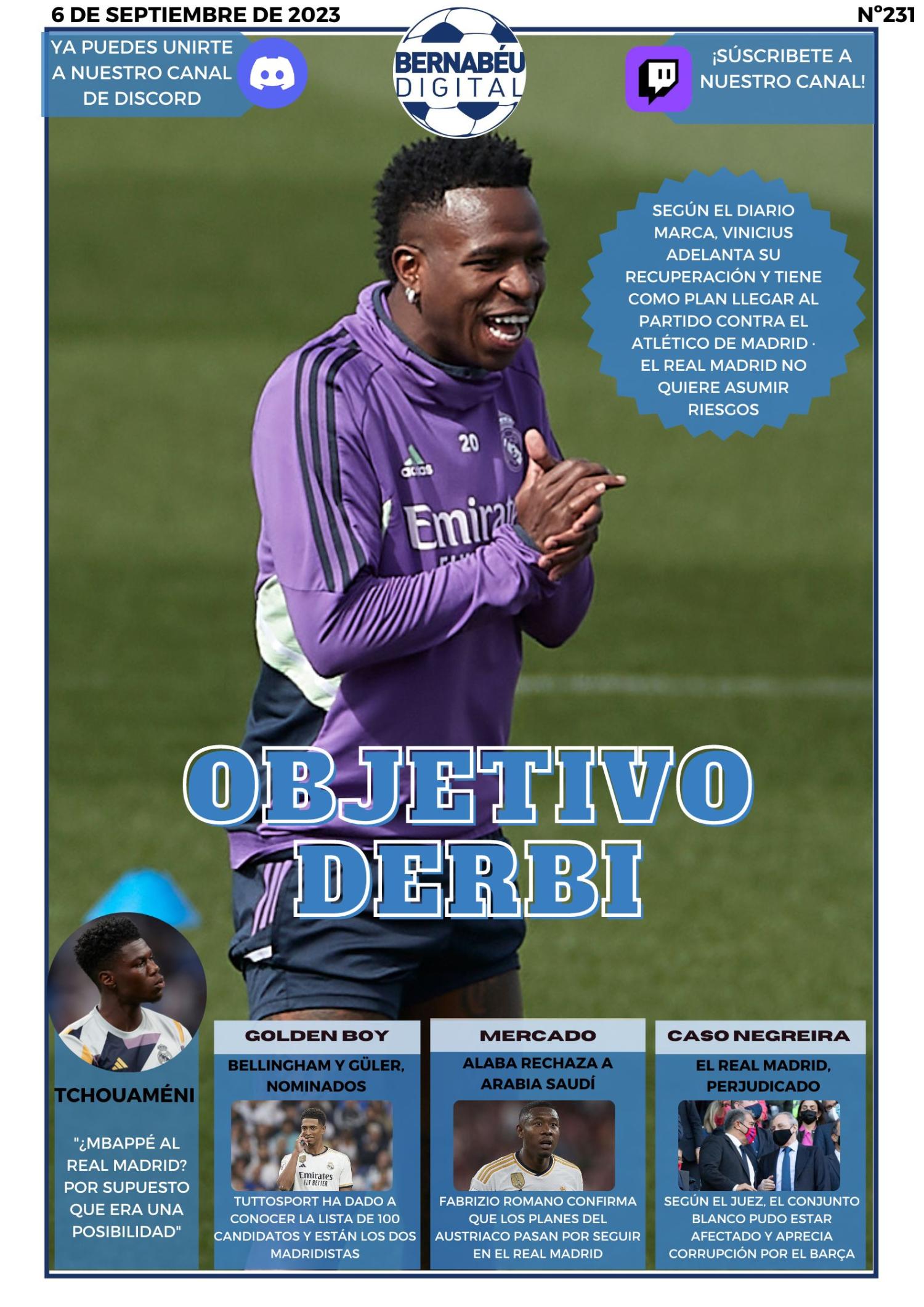 En la portada BD de este miércoles destacamos la recuperación y el plan de Vinicius con su recuperación. Además, hacemos referencia a las palabras de Tchouaméni sobre Mbappé, el rechazo de Alaba a Arabia Saudí, la última hora del Caso Negreira y los nominados al Golden Boy.