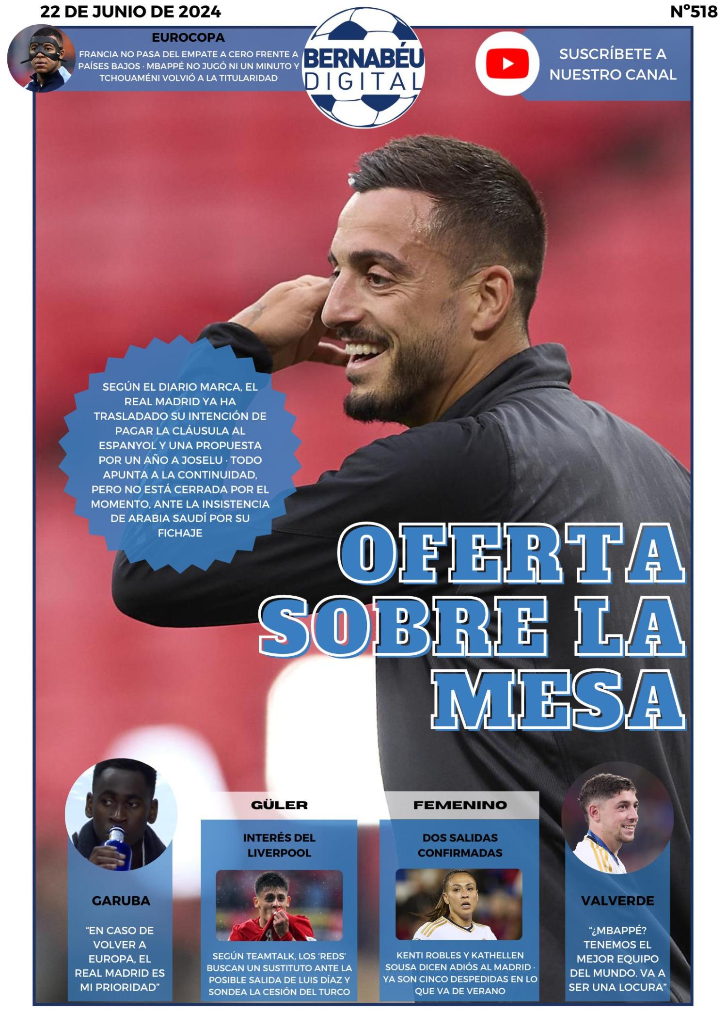 Este sábado 22 de junio Bernabéu Digital destaca en su portada la intención del Real Madrid de fichar a Joselu, y ya se lo ha trasladado al RCD Espanyol. También el empate de Francia ante Países Bajos con Kylian Mbappé en el banquillo, la intención de Usman Garuba de volver a su casa si retorna a Europa, el interés del Liverpool en Arda Güler y la salida de dos jugadoras más en la sección femenina.