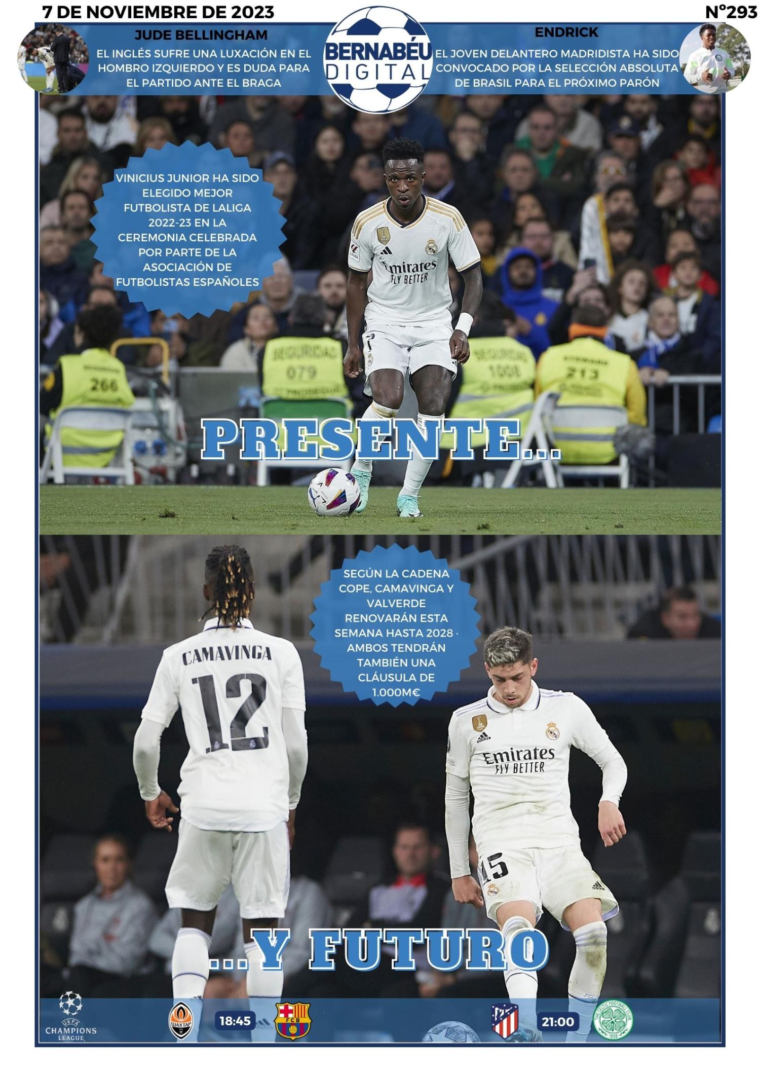 En nuestra edición de este martes 7 de noviembre de 2023, en Bernabéu Digital abrimos con el premio de Vinicius como mejor futbolista de LaLiga 2022-23 y con las inminentes renovaciones de Camavinga y Valverde hasta 2028 con el Real Madrid. Asimismo, destacamos la luxación en el hombro de Jude Bellingham y la convocatoria de Endrick con la absoluta de Brasil.