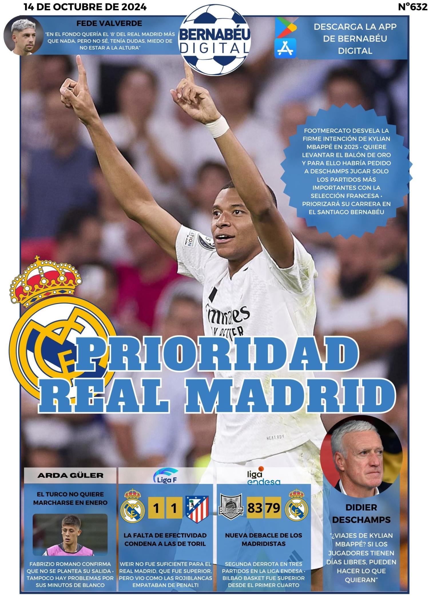 En nuestra portada del lunes 14 de octubre de 2024, en Bernabéu Digital hemos decidido abrir con Kylian Mbappé y su decisión de reservarse con la selección francesa solo para los partidos importantes, dando prioridad así al Real Madrid.