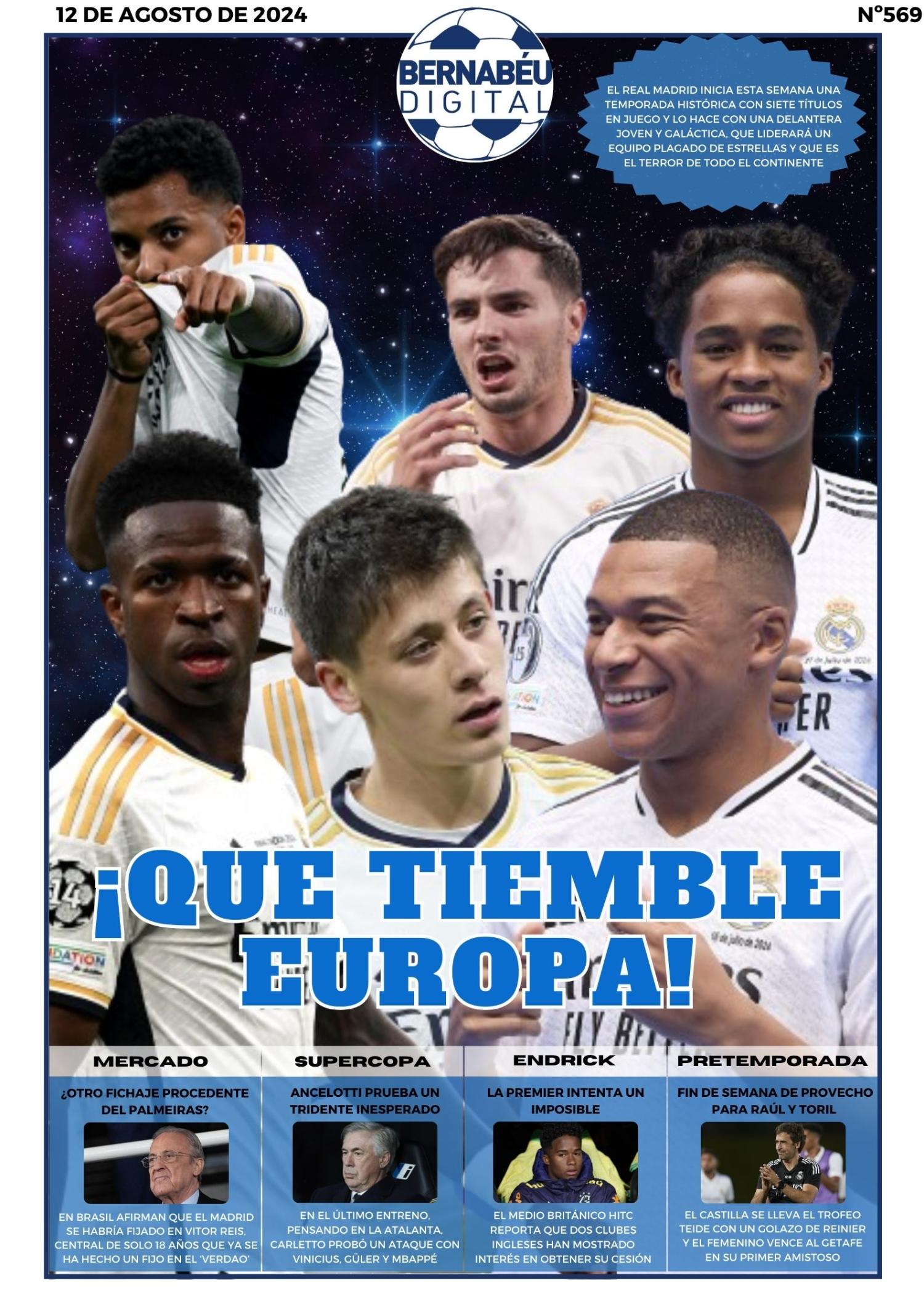 En nuestra portada de este lunes 12 de agosto de 2024, en Bernabéu Digital hemos decidido abrir con el arsenal ofensivo de la plantilla del Real Madrid. Asimismo, destacamos el rumor que sitúa al brasileño Vitor Reis en la órbita madridista, el futuro de Endrick y la pretemporada del Castilla y del femenino.