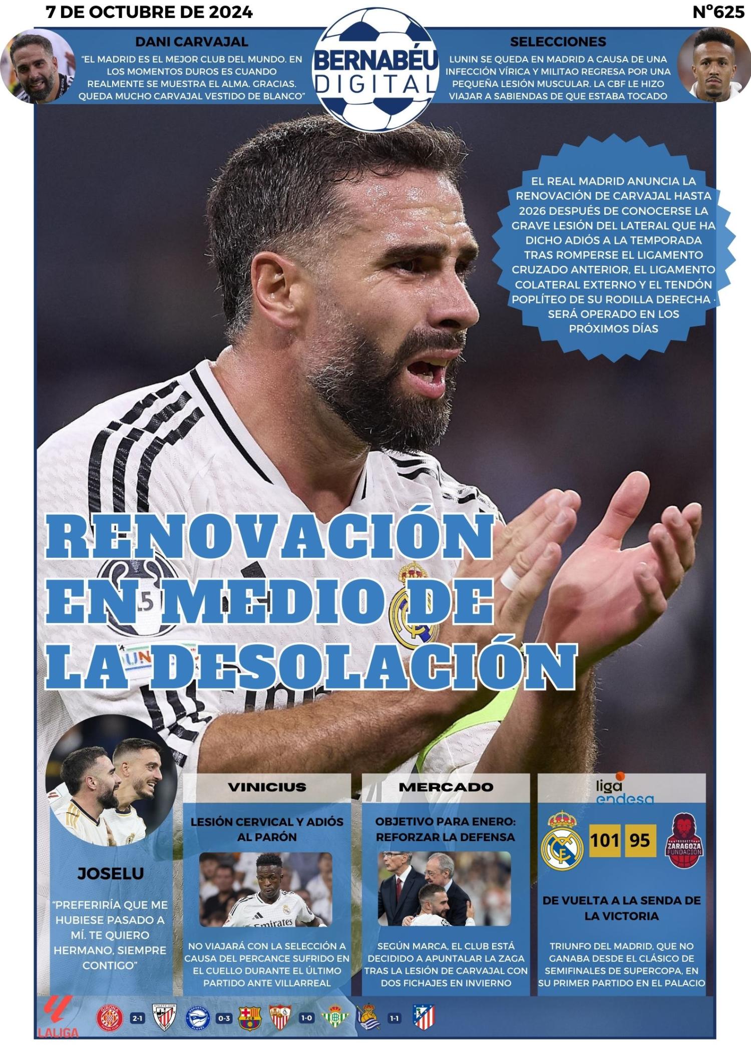 En nuestra portada del lunes 7 de octubre de 2024, en Bernabéu Digital hemos decidido abrir con la renovación y la lesión de Dani Carvajal.