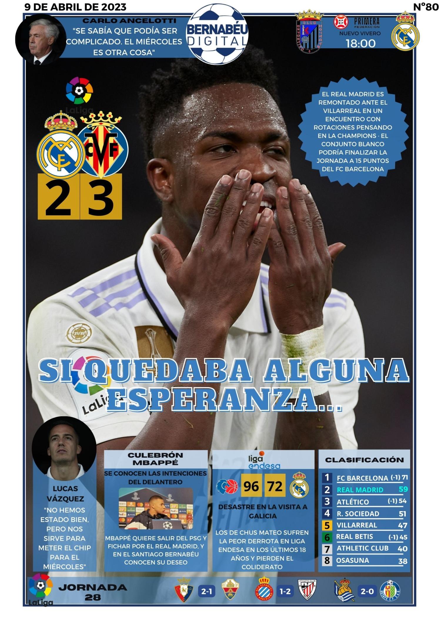 En la portada de este domingo de Bernabéu Digital destacamos la derrota del Real Madrid ante el Villarreal en la Liga Santander, dando prácticamente por claudicado el campeonato liguero. Además, destacamos las declaraciones pospartido de Ancelotti y Lucas Vázquez, la derrota de los de Chus Mateo y las novedades del culebrón Mbappé.