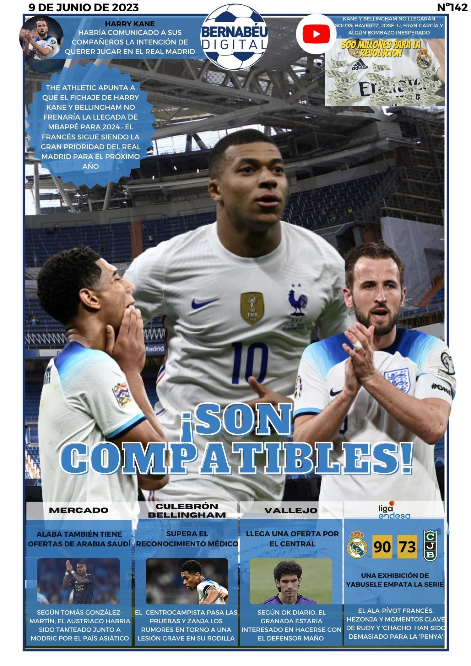 En nuestra portada de este jueves, en Bernabéu Digital abrimos con la información de The Athletic, según la cuál los hipotéticos fichajes de Kane y Bellingham por el Real Madrid no frenarían la llegada de Kylian Mbappé en 2024. Asimismo, destacamos el reconocimiento médico del centrocampista inglés, el futuro de Jesús Vallejo y las ofertas de Arabia Saudí a David Alaba y Luka Modric. Por último, nos hacemos eco de la victoria del conjunto blanco en baloncesto.