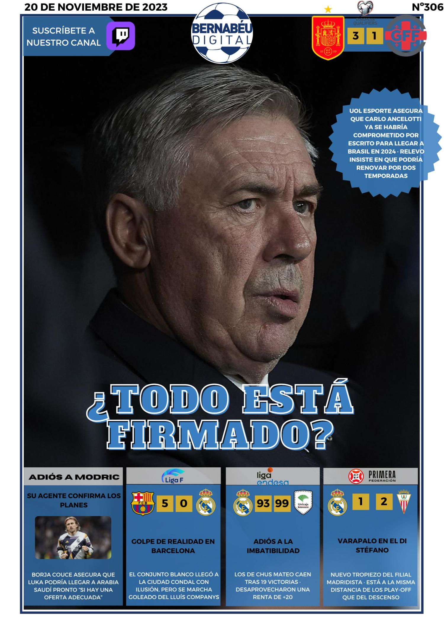 En nuestra portada del lunes 20 de noviembre de 2023, en Bernabéu Digital hemos decidido abrir con el supuesto acuerdo firmado entre Carlo Ancelotti y Brasil según UOL Esporte. Asimismo, destacamos las derrotas del femenino y del equipo de baloncesto, así como el futuro de Modric.