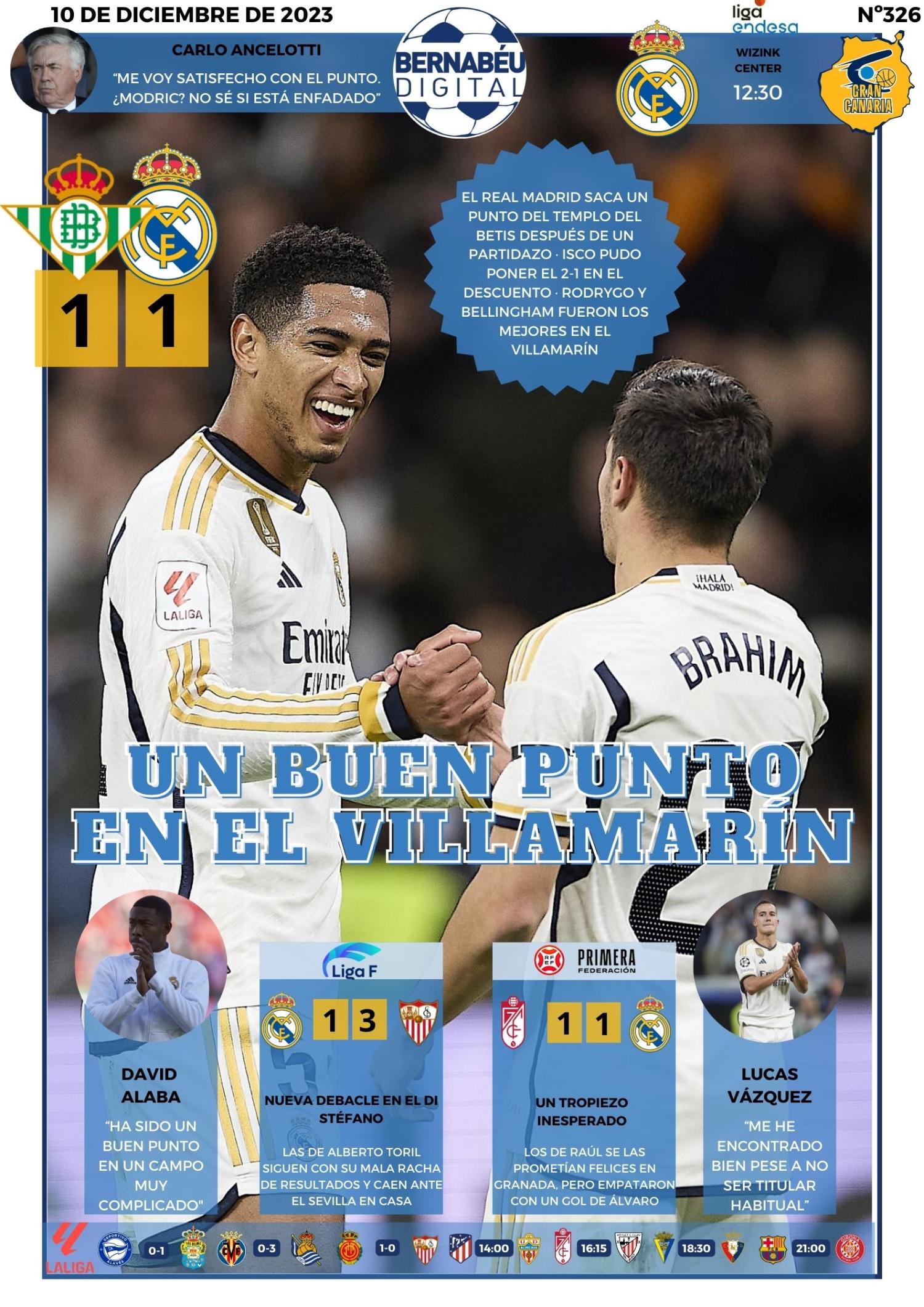 Para este domingo 10 de diciembre, en Bernabéu Digital destacamos en portada el buen punto obtenido por el Real Madrid en el Benito Villamarín. Los madridistas supieron salir con vida de un encuentro en el que tanto los blancos como el Betis tuvieron opciones de llevarse los tres puntos.