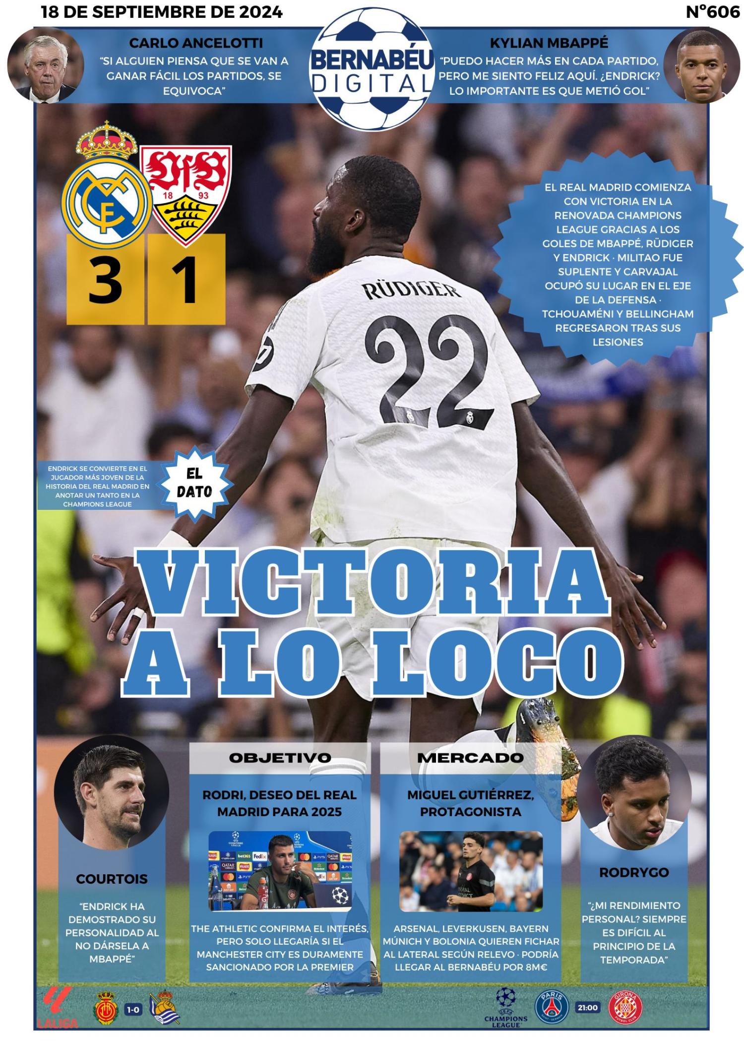 Bernabéu Digital destaca en su portada la sufrida victoria del Real Madrid contra el Stuttgart en la primer ajornada de la UEFA Champions League. Endrick, Mbappé y Rüdiger pusieron los goles en la segunda mitad.