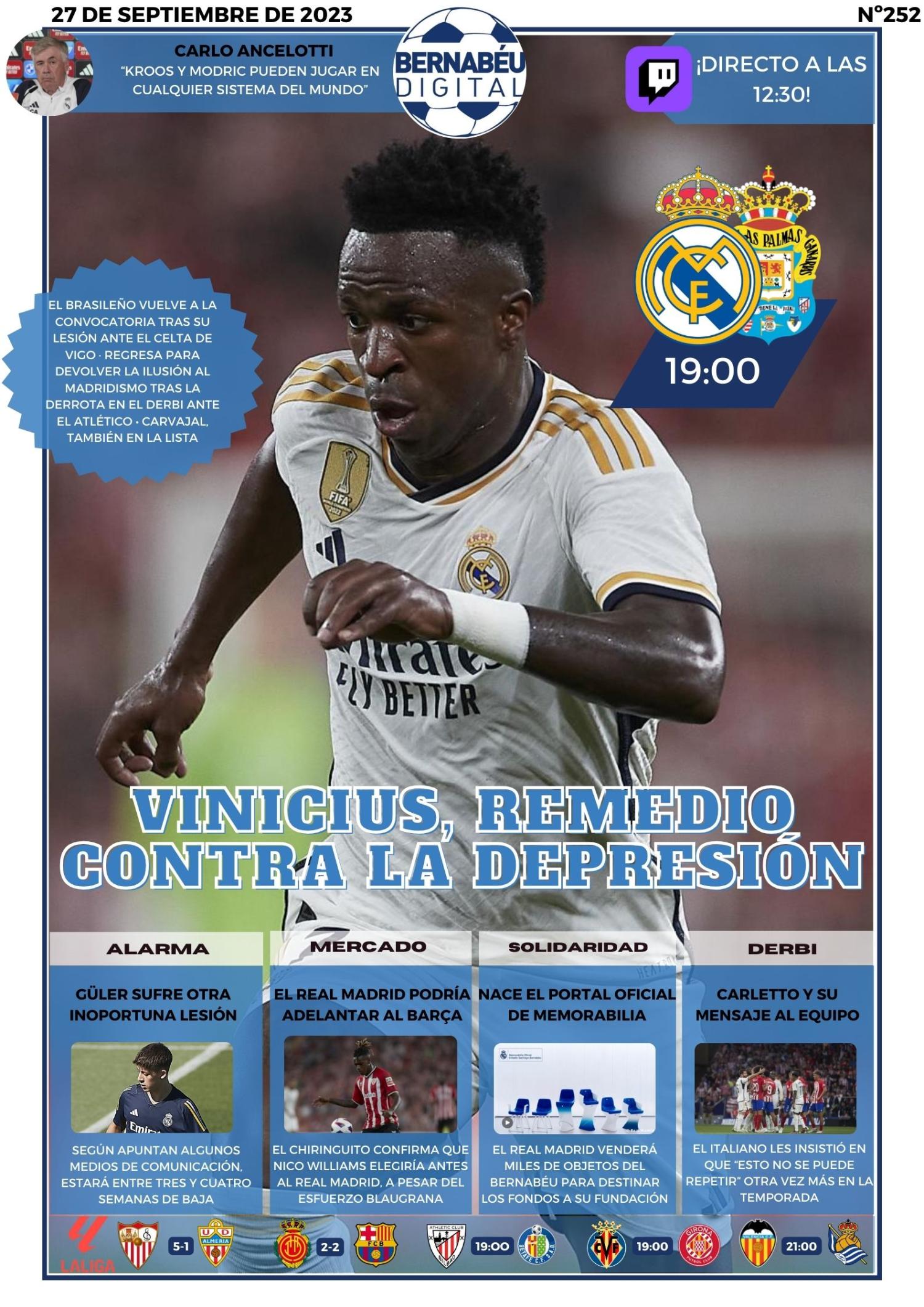 En su portada del miércoles 27 de septiembre de 2023, Bernabéu Digital destaca el regreso de Vinicius a la convocatoria del Real Madrid para recibir a la UD Las Palmas en el Santiago Bernabéu. La lesión de Güler también tiene su hueco, además del posible fichaje de Nico Williams por el conjunto madridista.