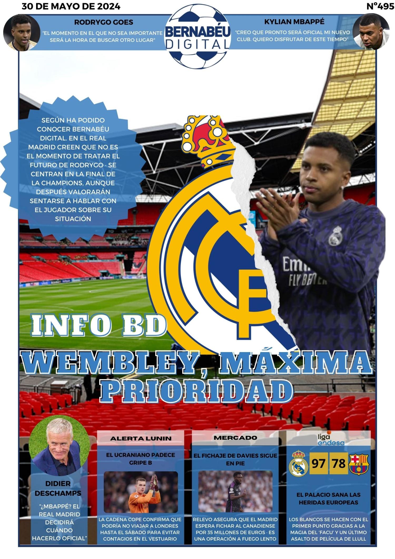 En la portada BD de este jueves destacamos la última INFO BD sobre los planes del Real Madrid tras las incendiarias declaraciones de Rodrygo sobre su futuro. Además, también hacemos referencia al clásico de baloncesto, las palabras de Deschamps, la opción de Davies en el mercado y la enfermedad de Lunin.