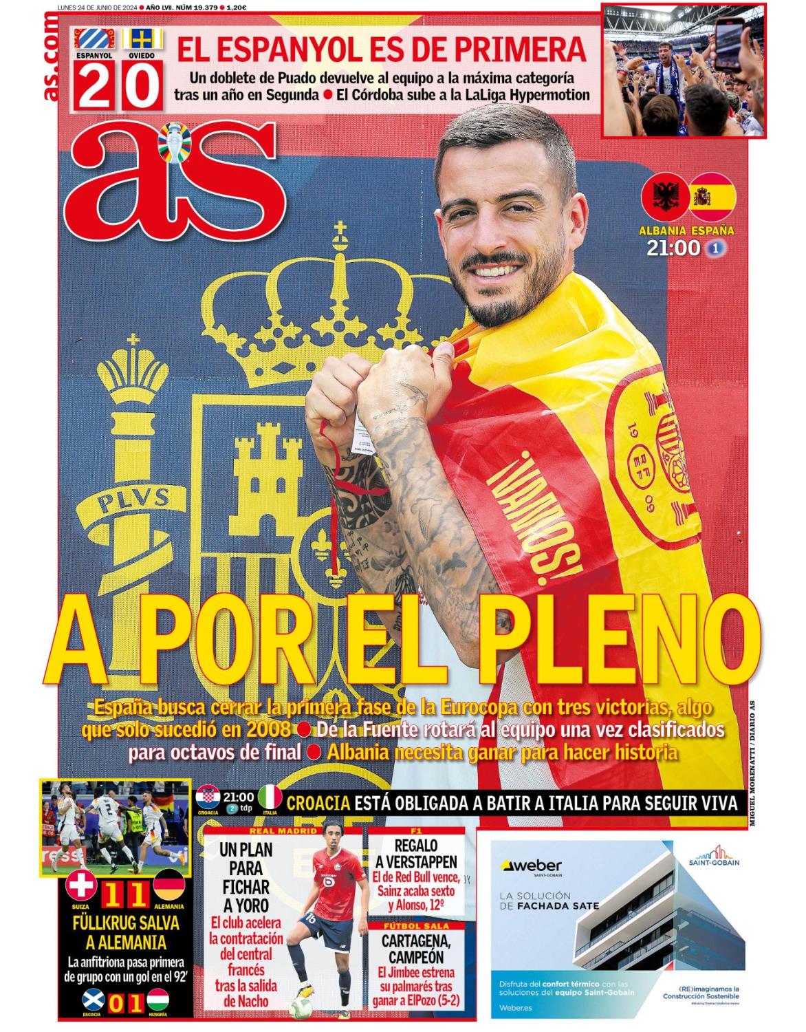 Joselu Mato y la selección española son los protagonistas en la portada de AS al poder conseguir el pleno en la fase de grupos de la Eurocopa 2024.