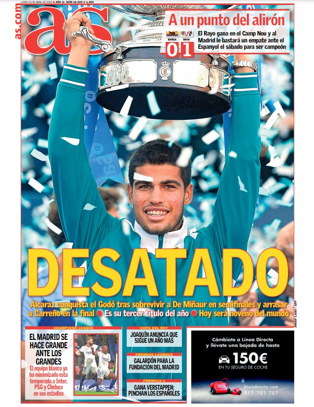 La portada de hoy del diario AS se enfoca en Carlos Alcaraz tras su conquista del Conde de Godó. Además, recalca que el Real Madrid "está a un punto del alirón" después de la derrota del Fútbol Club Barcelona ante el Rayo Vallecano.