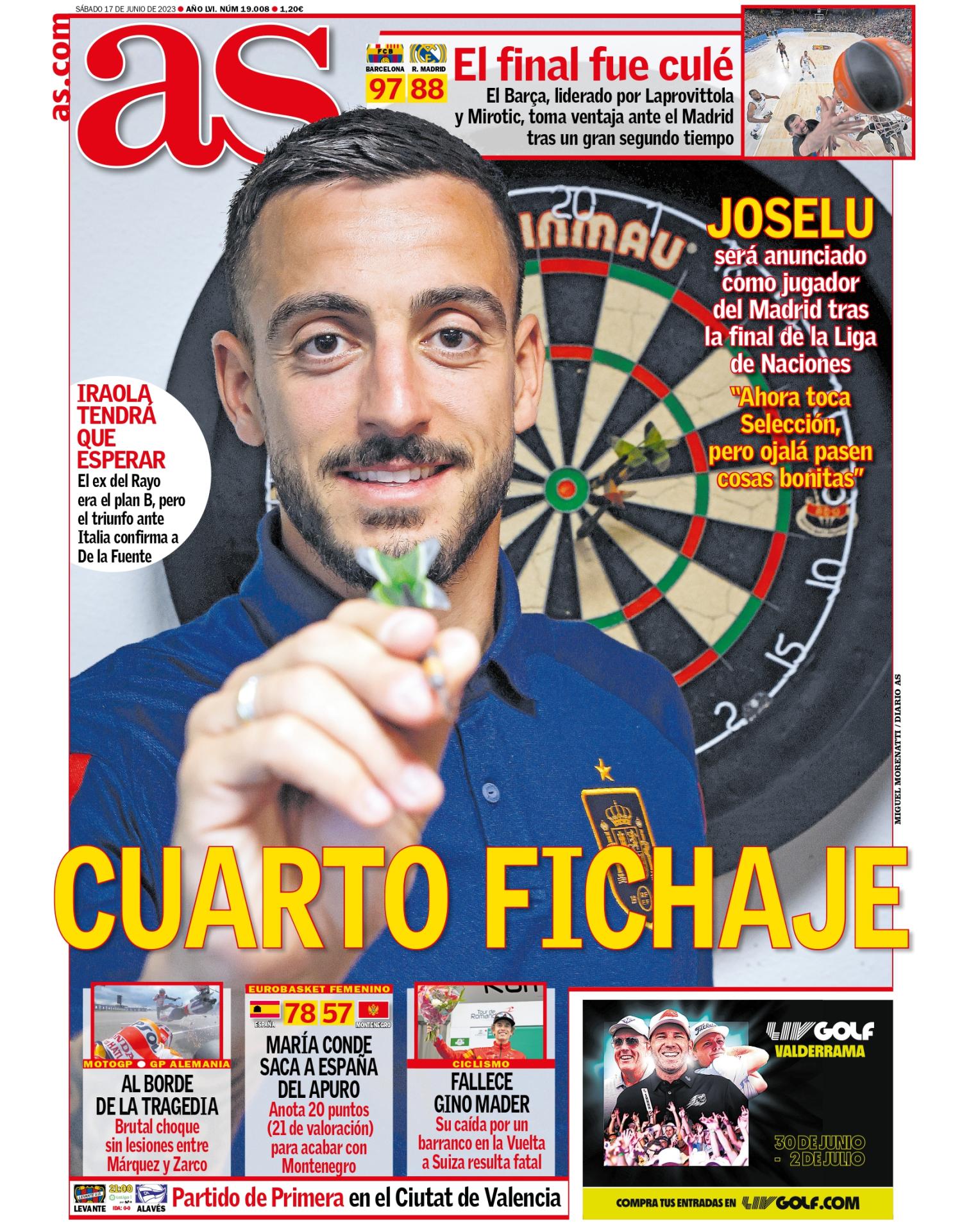 En su portada de este sábado, el diario AS abre con el inminente fichaje de Joselu Mato por el Real Madrid.