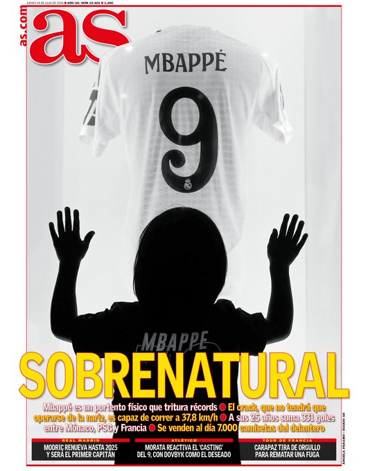 En su portada del jueves, el diario AS destaca el fenómeno Mbappé, poniendo el foco en varios récords que ha conseguido a lo largo de su carrera deportiva.