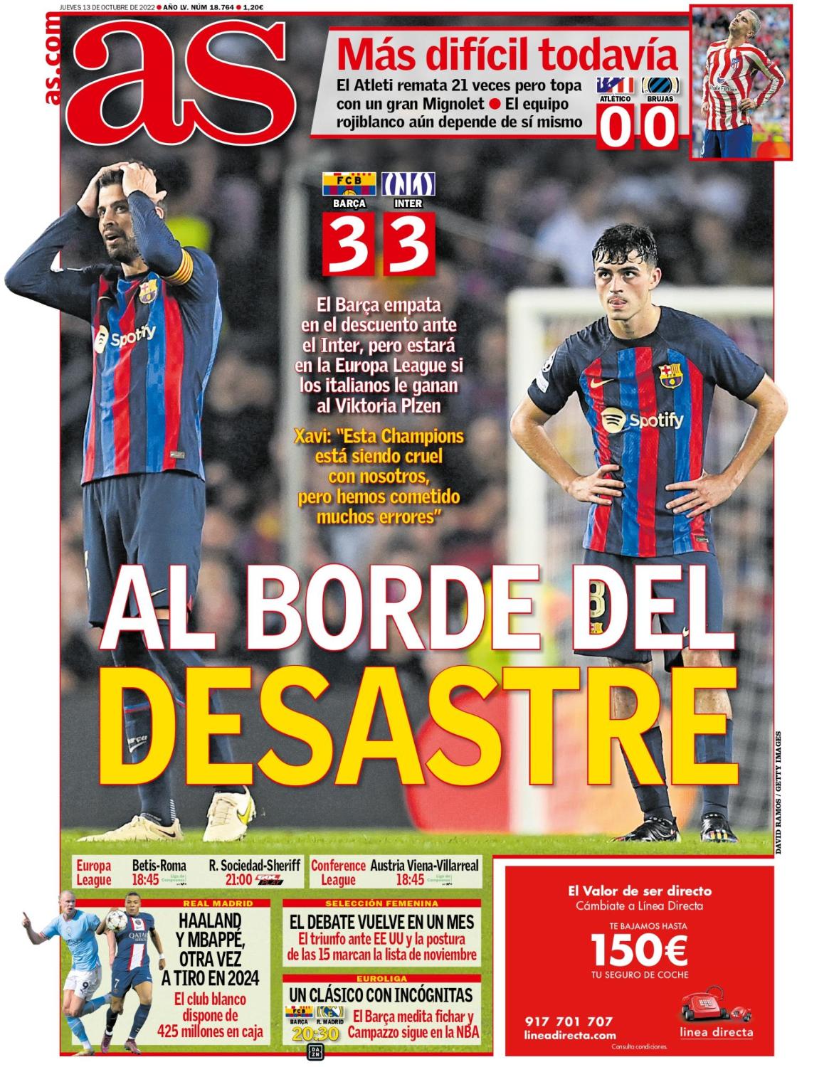 La debacle del FC Barcelona también ha sido la protagonista en la portada del diario AS. Los de Xavi Hernández han sido víctimas de nuevo de los fantasmas del pasado y se han quedado virtualmente fuera de la Champions League tras empatar en casa contra el Inter de Milán.