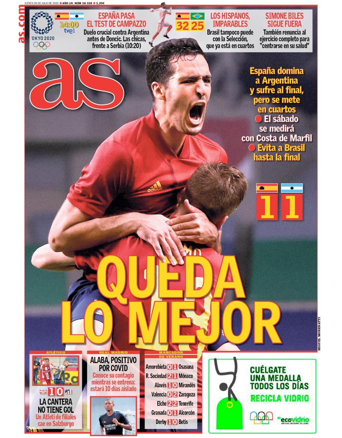 El diario AS presenta en la portada del jueves 29 de julio el pase a cuartos de final de la Selección Española de fútbol en los Juegos Olímpicos de Tokyo. El empate ante los argentinos lo hizo posible. Además, recalcan el positivo de David Alaba en Covid: "Conoce su contagio mientras se entrena. Estará 10 días aislado".