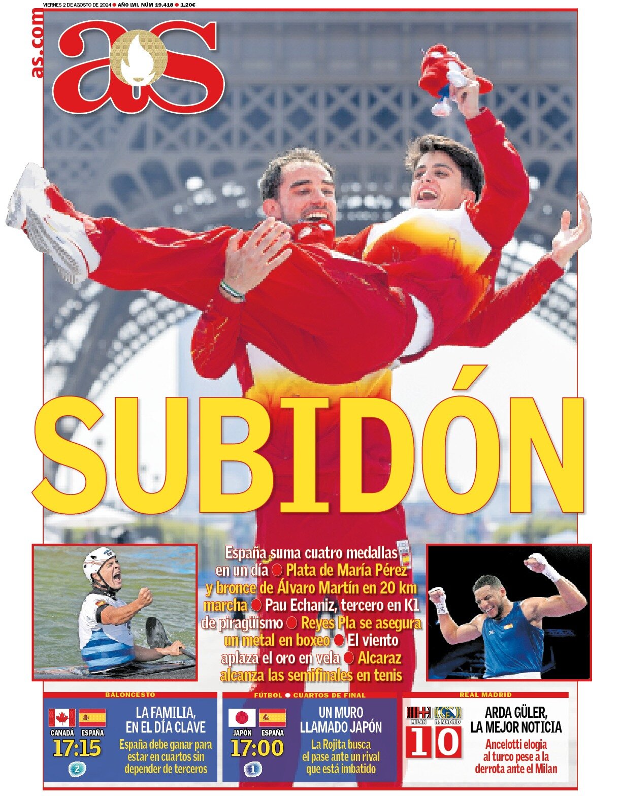 Este viernes 2 de agosto de 2024, el diario as saca en portada las medallas de España en los 20 km marcha, y en K1 de piragüismo, y destaca la derrota del Real Madrid en su primer amistoso de pretemporada ante el AC Milan.