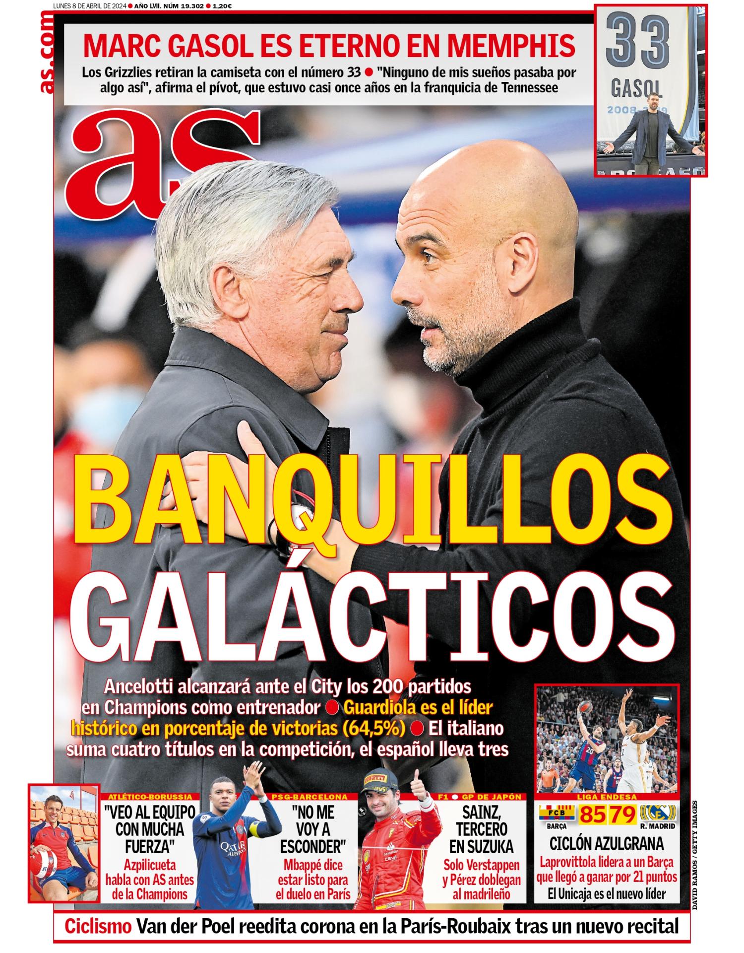 Este lunes 8 de abril de 2024, el diario as saca en portada el duelo de "banquillos galácticos" entre Carlo Ancelotti y Pep Guardiola, dos de los mejores entrenadores del mundo, con varios hitos extraordinarios en la Champions League.