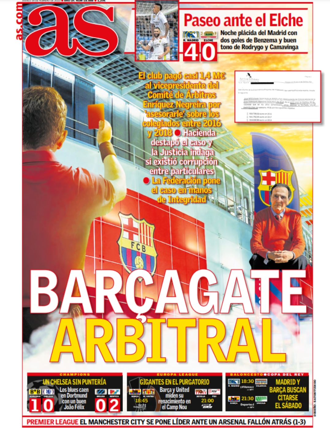 AS abre con el escándalo del FC Barcelona tras salir a la luz los pagos al exvicepresidente del Comité Técnico de Árbitros del fútbol español entre los años 2016, 2017 y 2018.