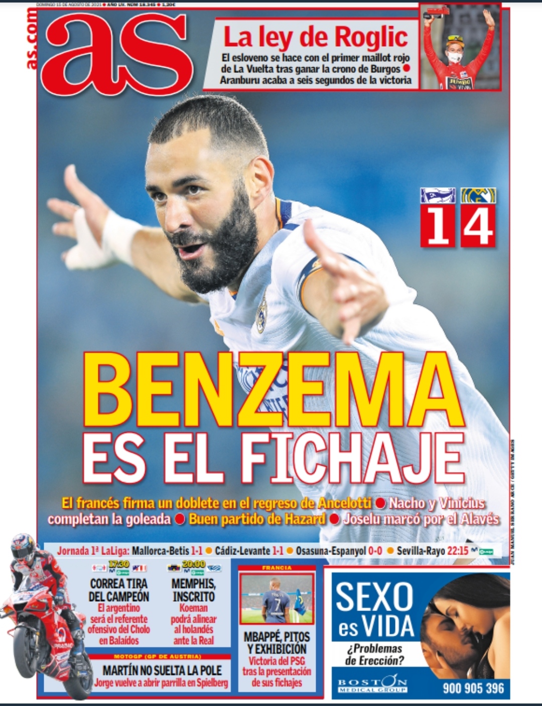 La victoria del Real Madrid ante el Alavés también copa la portada del diario AS. Los de Carlo Ancelotti se ponen líderes de forma provisional tras ganar y convencer por 1-4. Hazard y Bale fueron dos de los mejores en la noche de ayer, aunque el claro MVP fue Karim Benzema con un nuevo doblete en Liga.