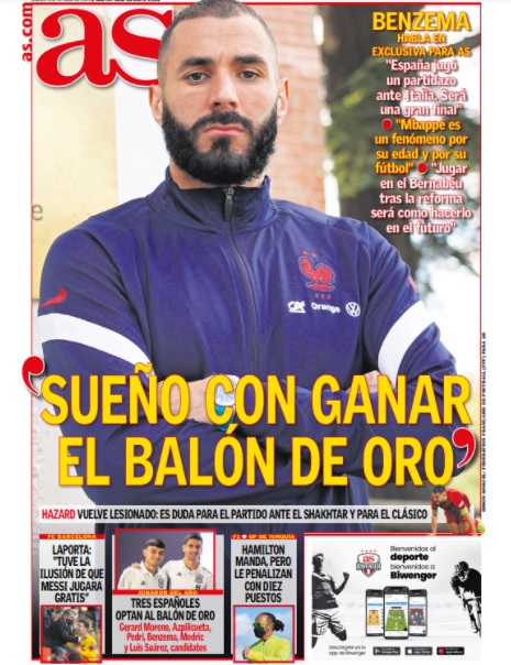 La portada de hoy del diario As presenta en exclusiva la entrevista que ha realizado a Karim Benzema que está concentrado con su selección para jugar la final de la UEFA Nations League contra España. El delantero francés ha declarado que quiere ganar el Balón de Oro con estas palabras: "Sueño con ganar el Balón de Oro". Además, destacan los tres nominados españoles para ese galardón que son Gerard Moreno, Gavi y César Azpilicueta.