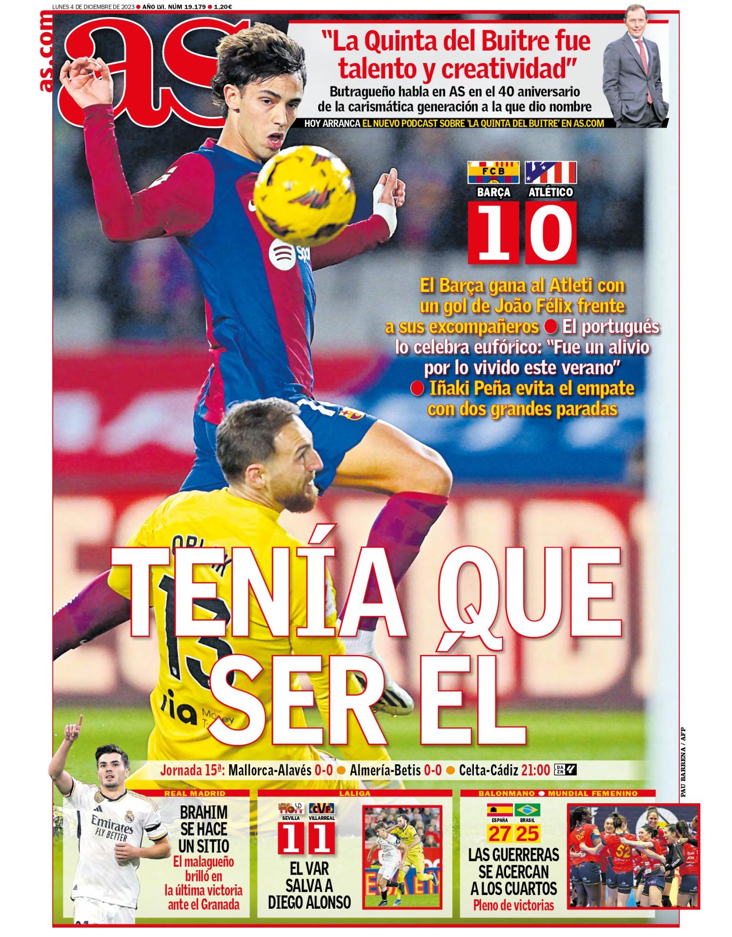 Este lunes 4 de diciembre, el diario as destaca la victoria del Barcelona sobre el Atlético, con gol de Joao Félix, y resalta también el buen rendimiento que está ofreciendo Brahim en los últimos partidos.