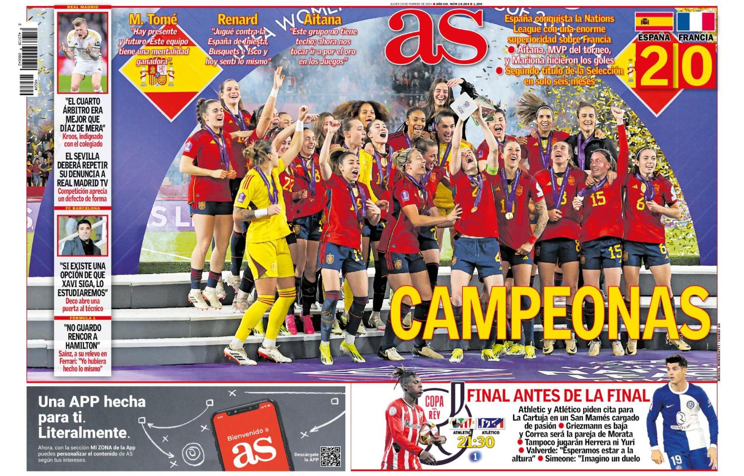 En su edición de este jueves, el diario AS abre su portada con la victoria de la selección española de fútbol femenino en la UEFA Nations League. Un encuentro donde hubo varias jugadoras del Real Madrid que salieron campeonas.