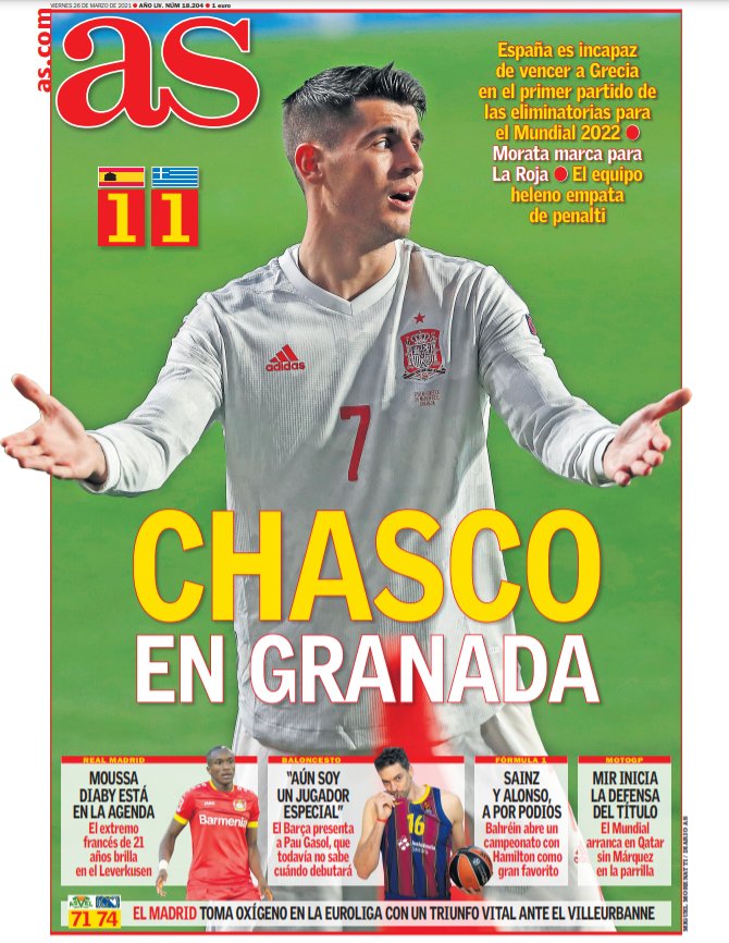 El diario as también destaca hoy en su portada el batacazo de España ante Grecia. La selección fue incapaz de pasar del empate ante un conjunto heleno muy inferior, pero que, sin embargo, logró rascar un punto en el primer encuentro de la fase de clasificación para el próximo mundial de Qatar de 2022.