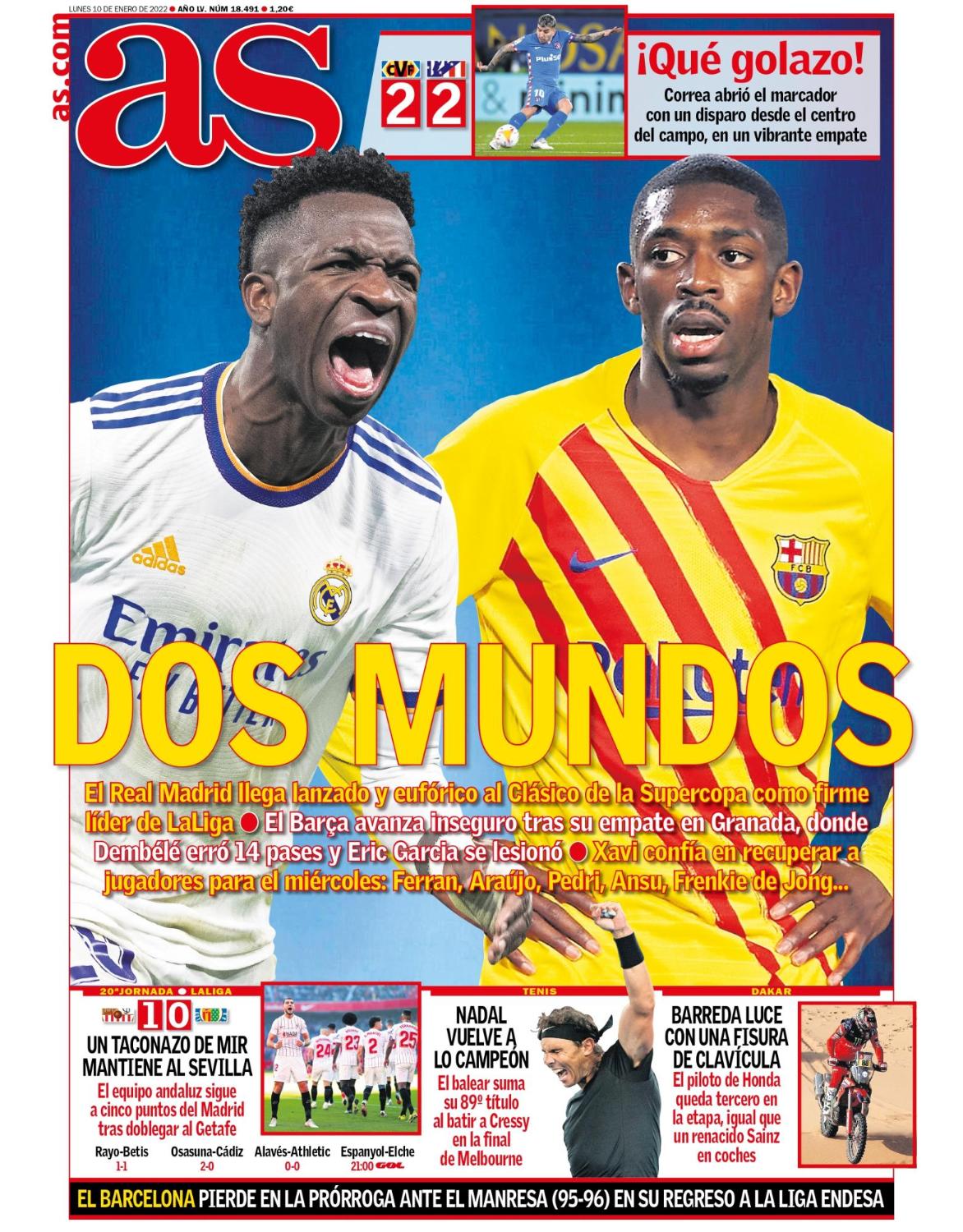 La portada de hoy del diario AS lleva como protagonistas a Vinicius Jr. y a Ousmane Dembelé. Real Madrid y Fútbol Club Barcelona se medirán en las semifinales de la Supercopa de España el próximo miércoles.