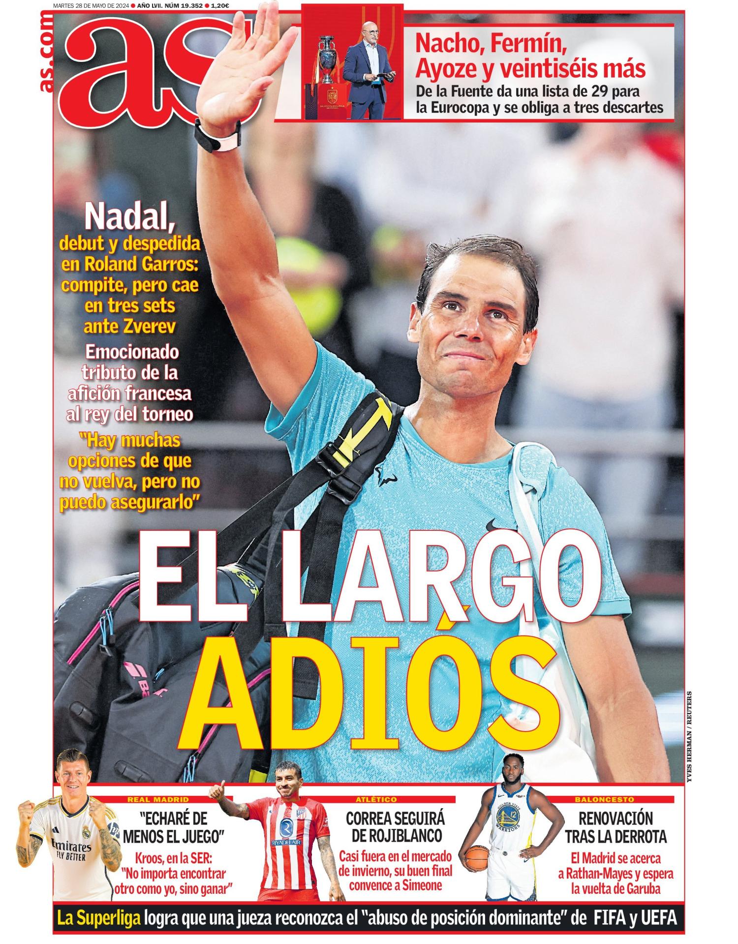 El diario As abre su portada con la derrota de Rafa Nadal en Roland Garros y también con la entrevista de Toni Kroos en la Cadena SER donde habla sobre su retirada.