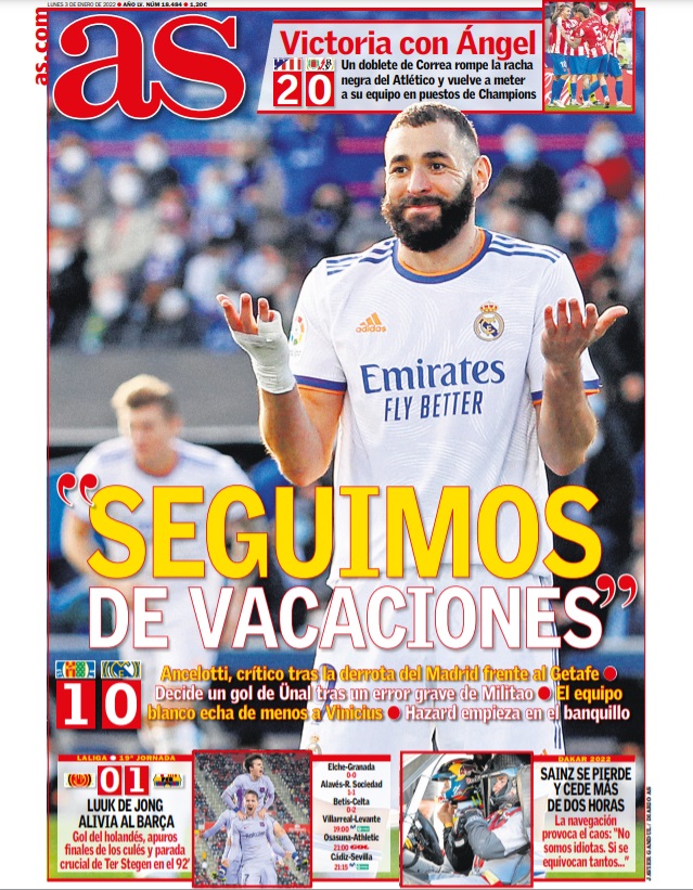 El diario AS destaca en portada la derrota del Real Madrid en su visita al Getafe. Los azulones cosecharon los tres puntos gracias al solitario gol de Enes Ünal, que aprovechó un error garrafal de Militao para anotar el 1-0 a los 9 minutos de partido.