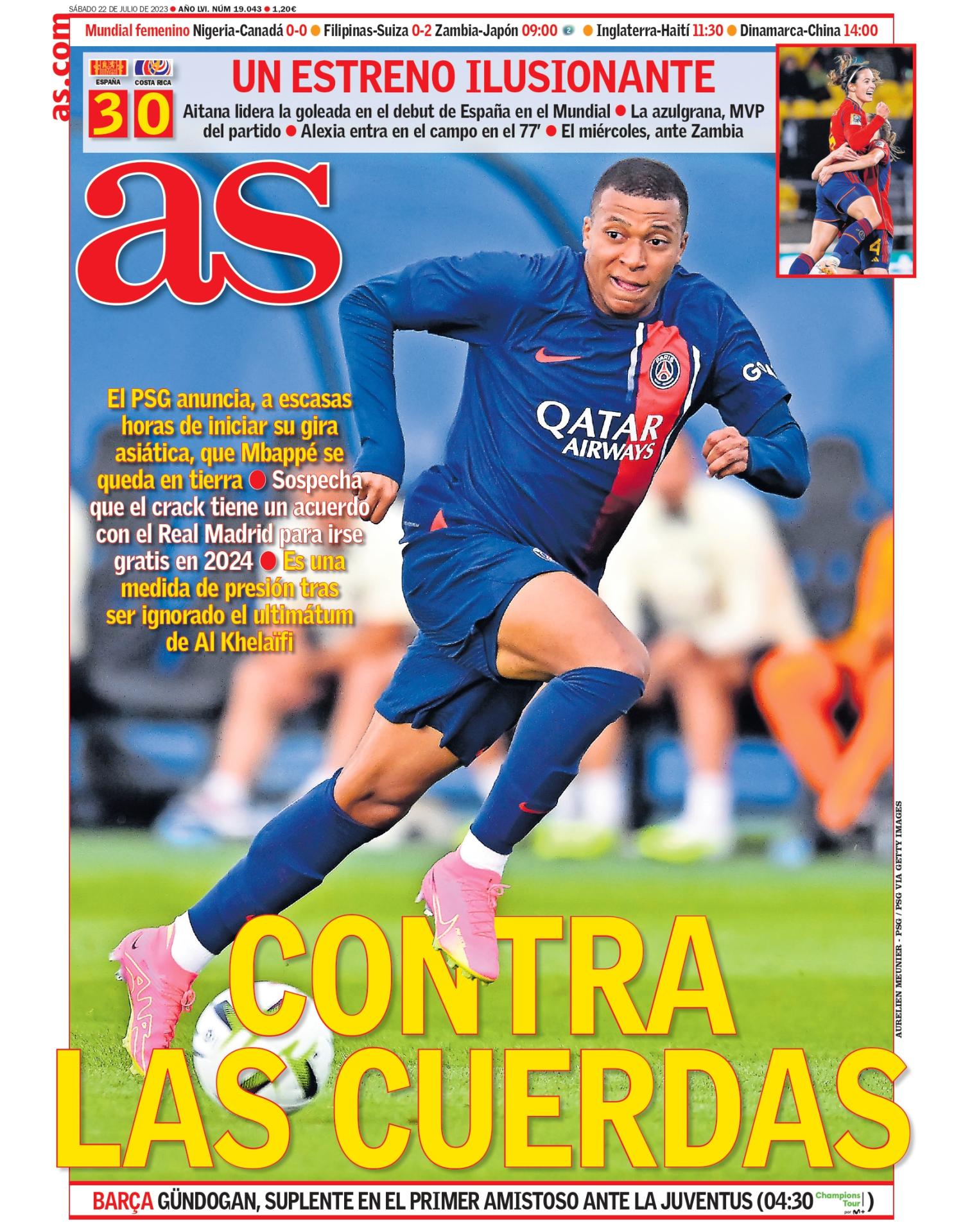 El diario As destaca en su portada la decisión del PSG de dejar fuera de la gira de pretemporada a Kylian Mbappé. El objetivo es dar una medida de presión tras haber ignorado el ultimátum que le dieron en el club parisino de tomar una decisión acerca de una renovación o un traspaso este verano.