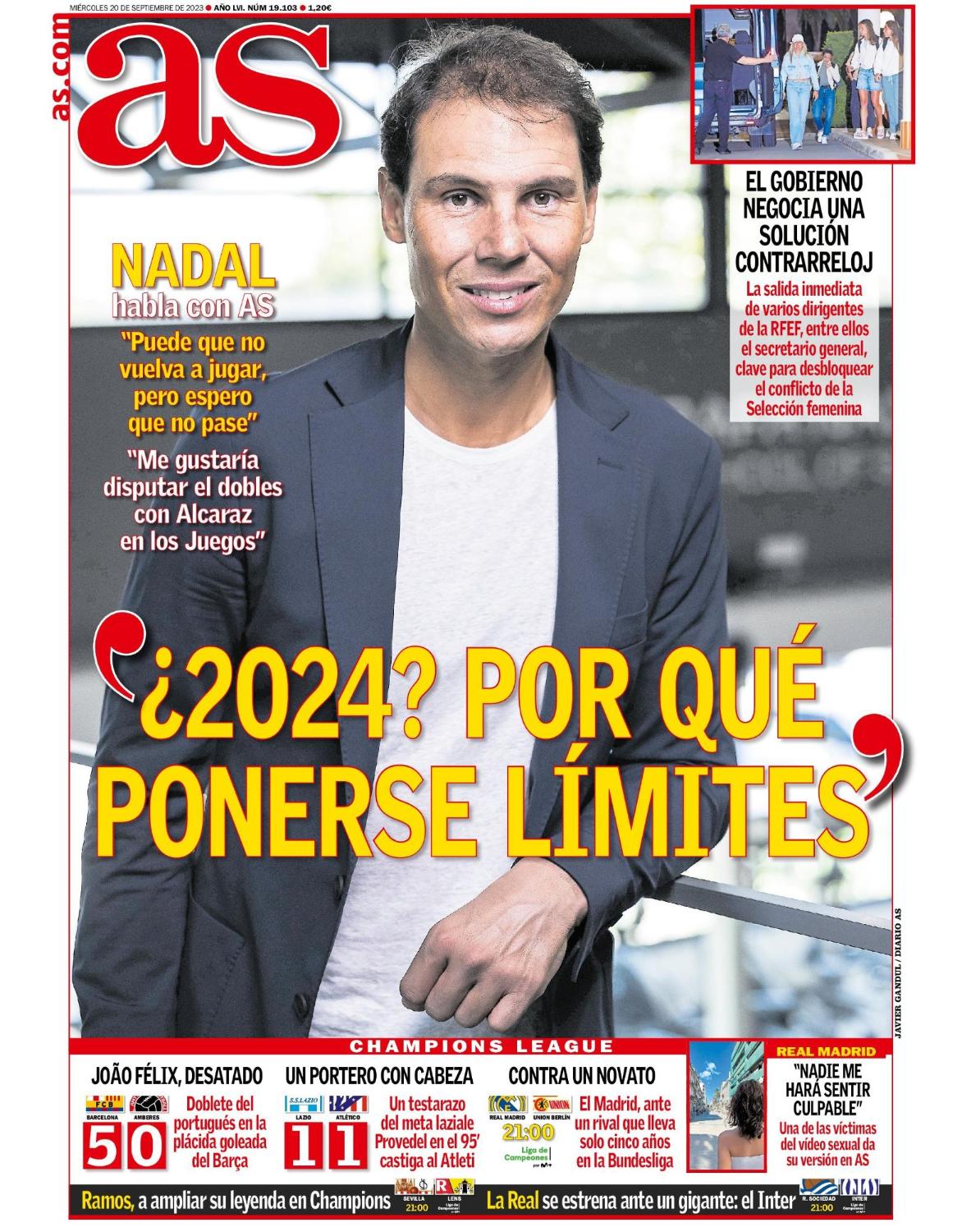 El diario As publica en su portada una entrevissta a Rafa Nadal para hablar de su carrera y su posible retirada. También analizan la previa del partido de Champions entre el Real Madrid y el Union Berlín, club que solo lleva 5 años en la élite.