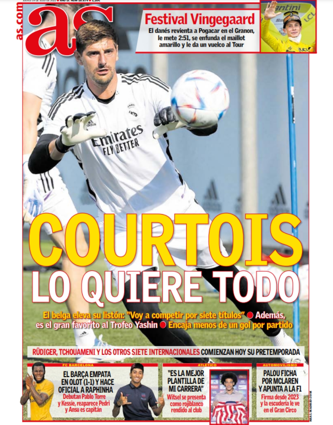 Thibaut Courtois es el protagonista en la portada del diario AS. El guardameta belga quiere ganar los siete títulos que tiene en disputa el Real Madrid esta temporada, situación que complica los minutos a Andriy Lunin.