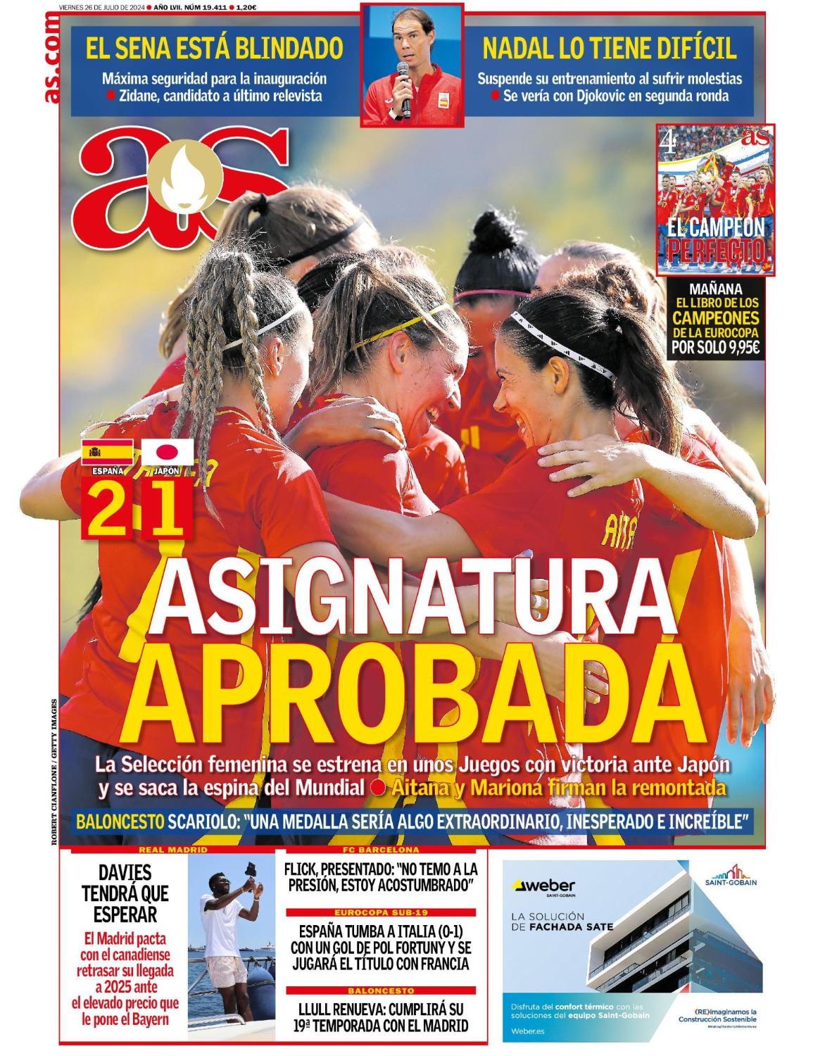 Este viernes 26 de julio de 2024, el diario as saca en portada la victoria de la selección española femenina ante Japón (2-1) en su debut en los Juegos Olímpicos, y destaca también el pacto del Real Madrid con Alphonso Davies: esperar a 2025 para abordar el traspaso.