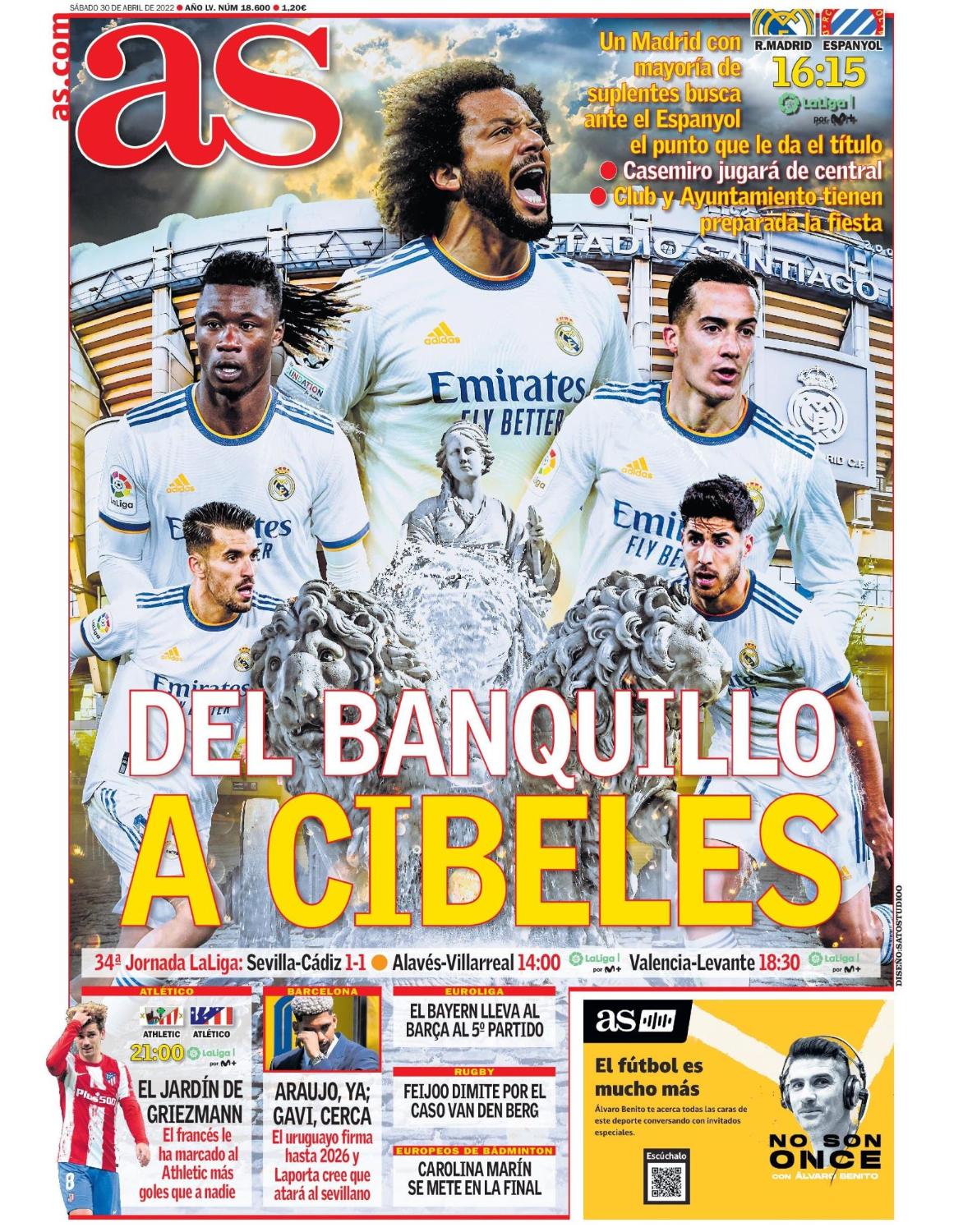 El diario as saca hoy en portada el encuentro entre el Real Madrid y el Espanyol en el cual, siempre y cuando consigan al menos un punto, los blancos podrían proclamarse campeones de LaLiga y en el que habrá bastantes rotaciones, teniendo en cuentas las bajas que arrastra el equipo y la vuelta de las semifinales de Champions contra el City.