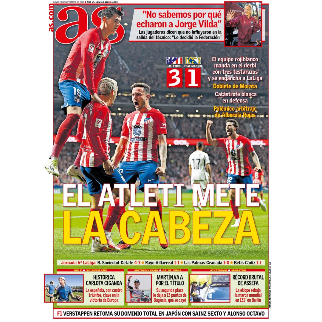 El diario AS resume el derbi madrileño con el siguiente titular en su portada de hoy: "El Atleti mete la cabeza". El Real Madrid se marchó del Civitas Metropolitano derrotado por 3-1.