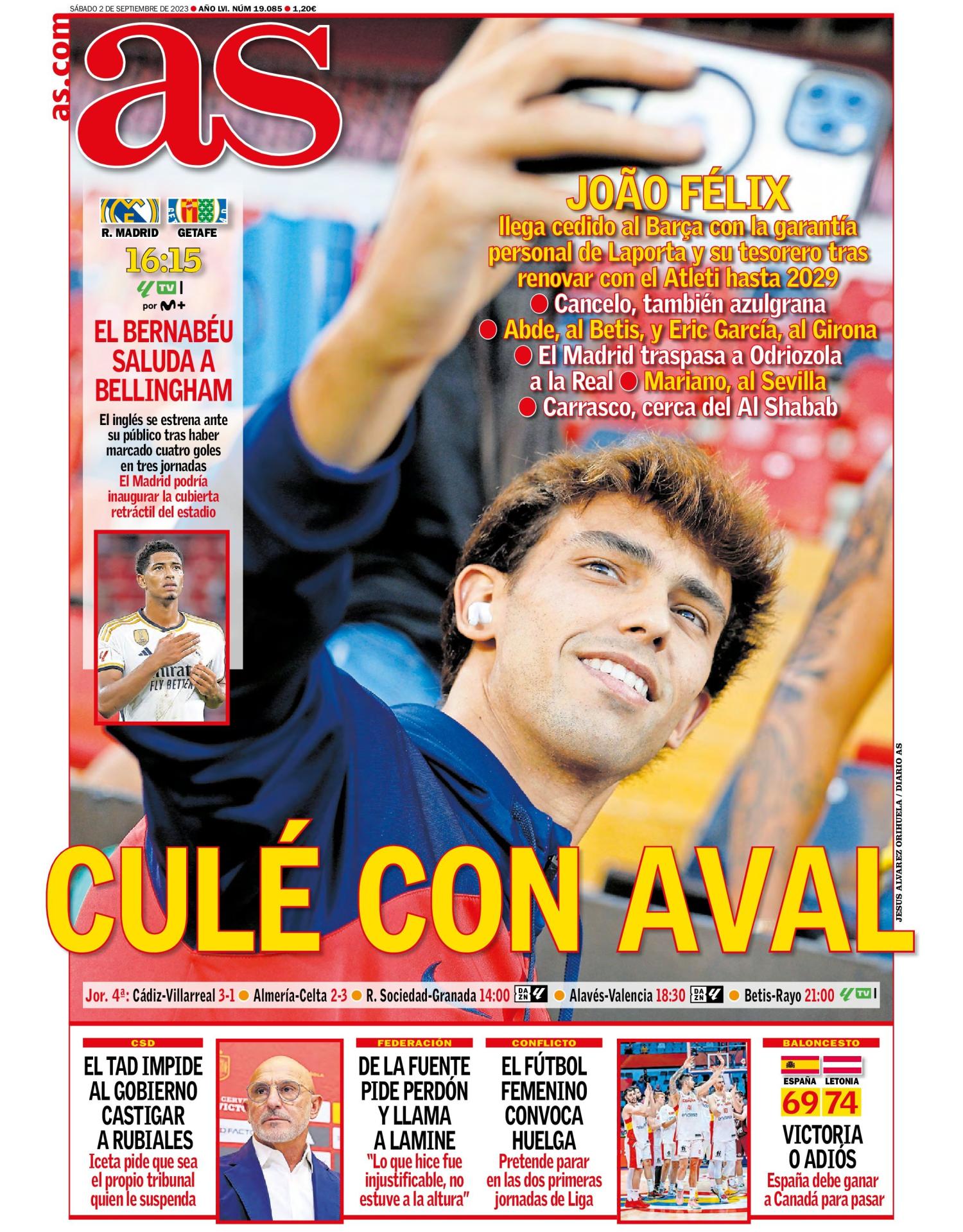 El diario As abre con la previa del partido del Real Madrid contra el Getafe en el Santiago Bernabéu. Además, destacan el fichaje de Joao Félix por el FC Barcelona.