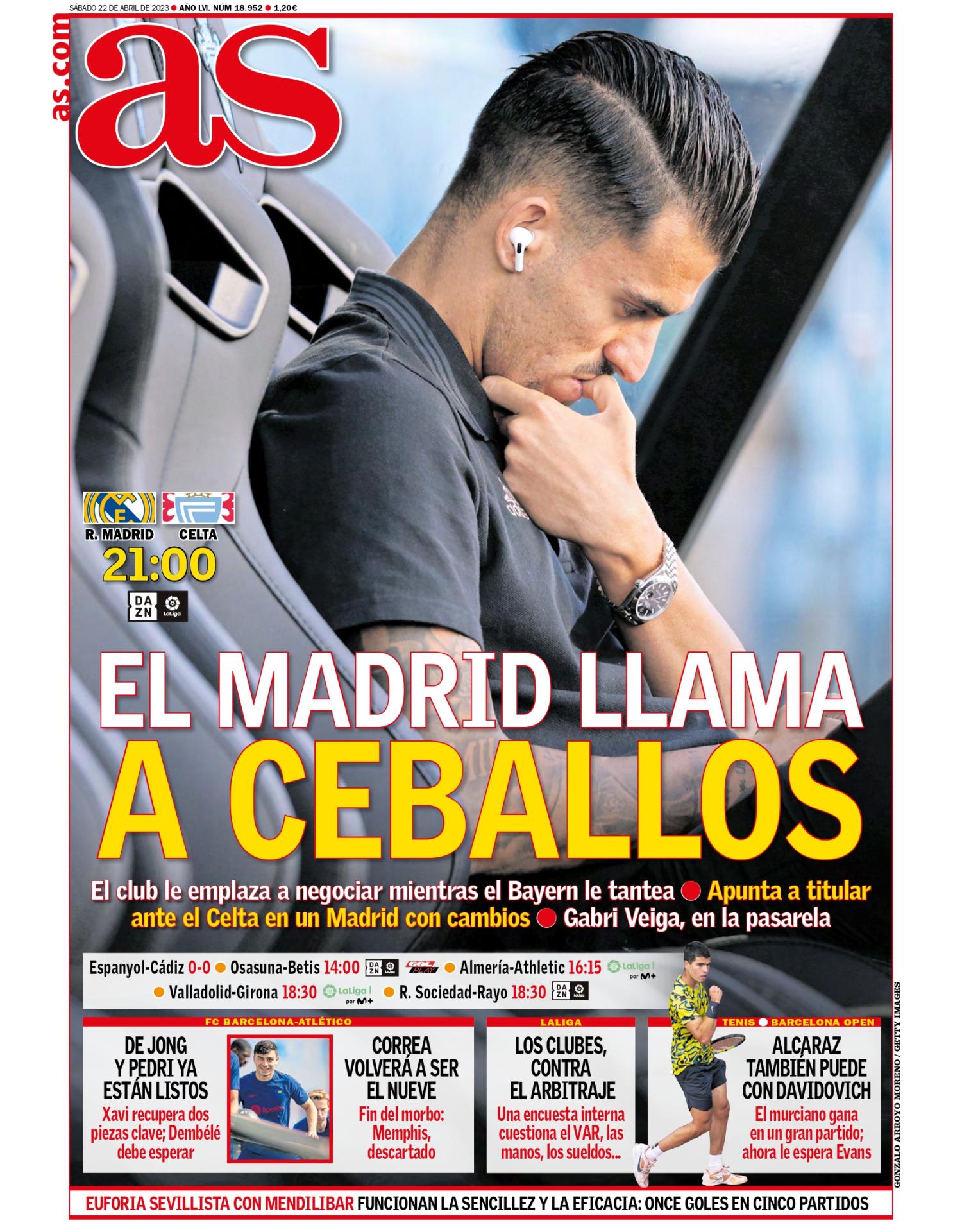 El diario As sale este sábado en su portada con Dani Ceballos. Y es que el Real Madrid llama al utrerano para negociar la renovación mientras que el Bayern de Múnich tantea al centrocampista. El andaluz apunta a titular en el encuentro ante el Celta.