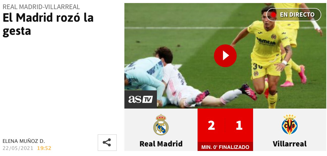 El As sale en su portada web con el titular siguiente: "El Madrid rozó la gesta". Los blancos no pudieron ganar la Liga porque el Atlético ganó al Real Valladolid. Ambos cumplieron y el título se quedó en el Metropolitano.