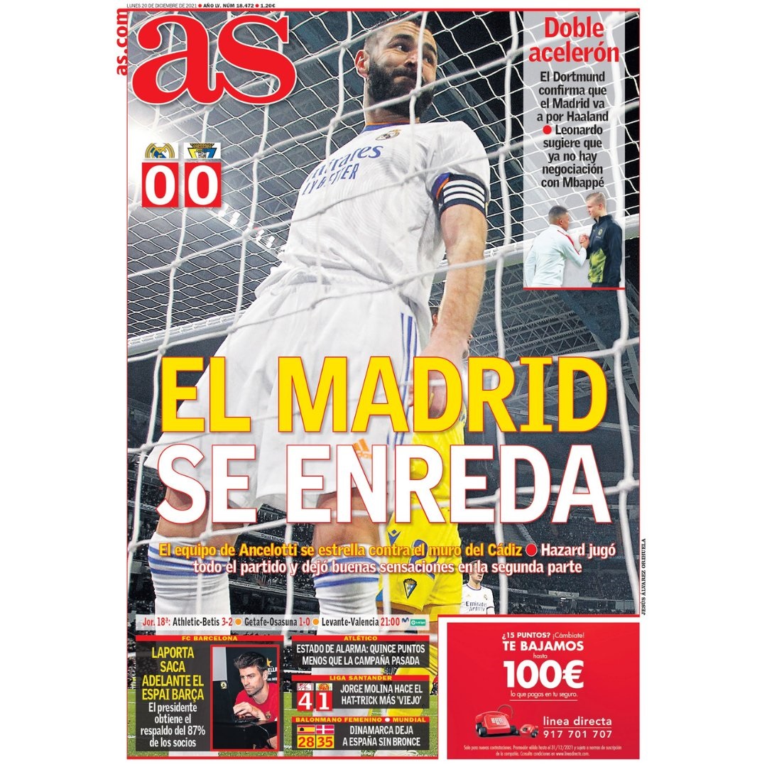 El Real Madrid no pudo pasar del empate contra el Cádiz en el Santiago Bernabéu tal y como refleja el diario AS en su portada del lunes. Los blancos se estrellaron una y otra vez con la muralla gaditana, que puntúa a domicilio contra los 'merengues' por segunda temporada consecutiva.